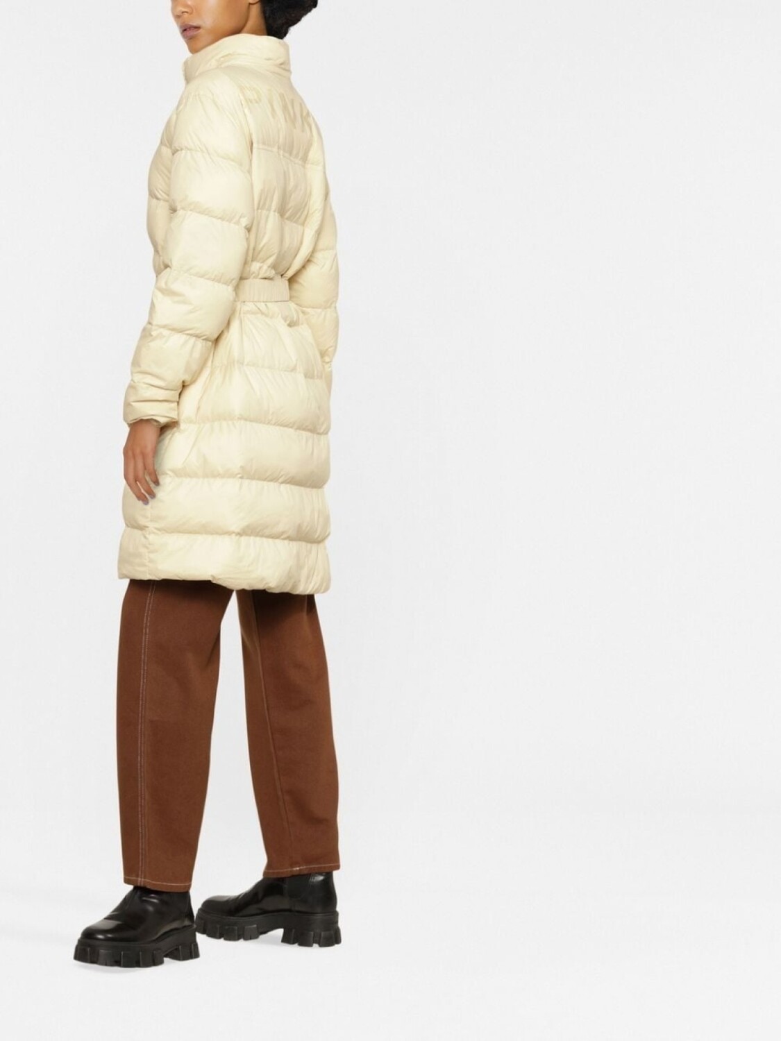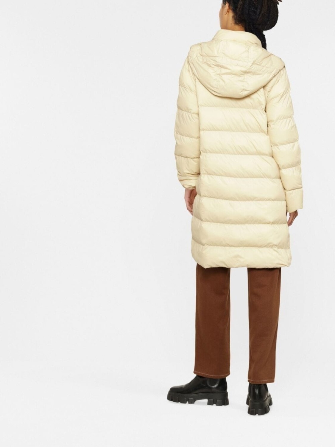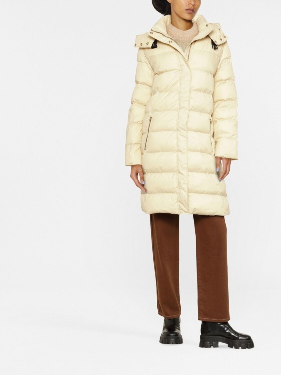 Бежевый, дутый материал, классический капюшон, длинные рукава, застежка на молнии спереди и два кармана на молнии по бокам.