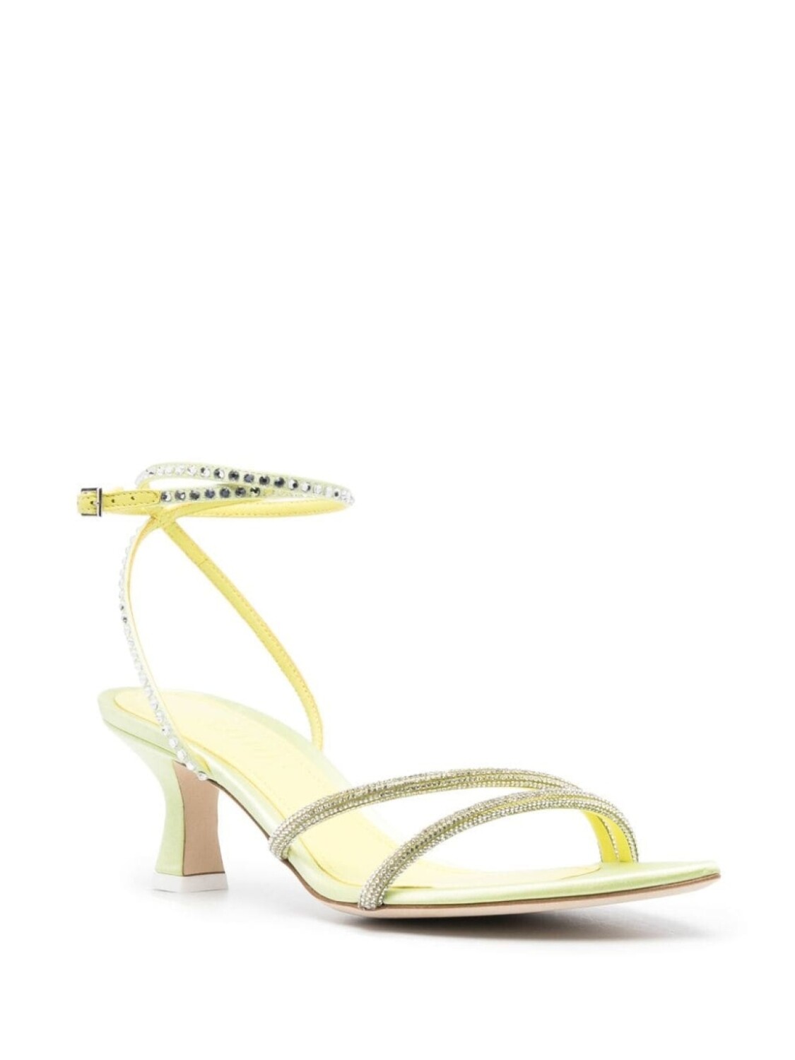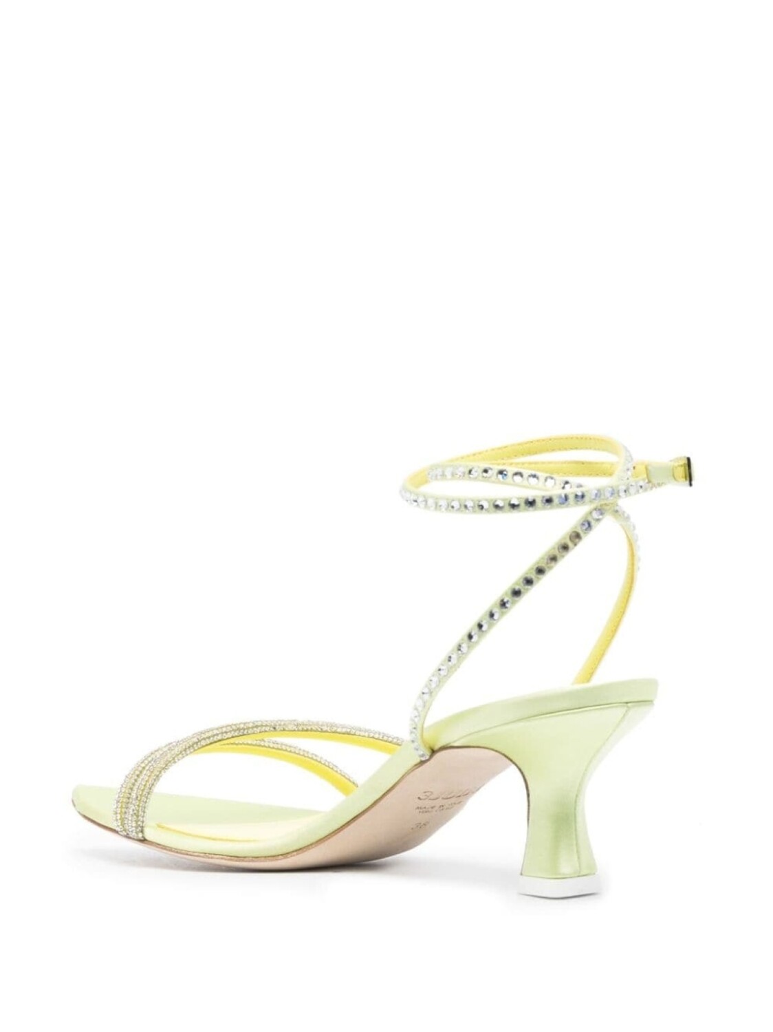 Салатовый, телячья кожа, ремешок на щиколотке с пряжкой, серебристый, декор из кристаллов, открытый носок, стелька с логотипом и высокий каблук.