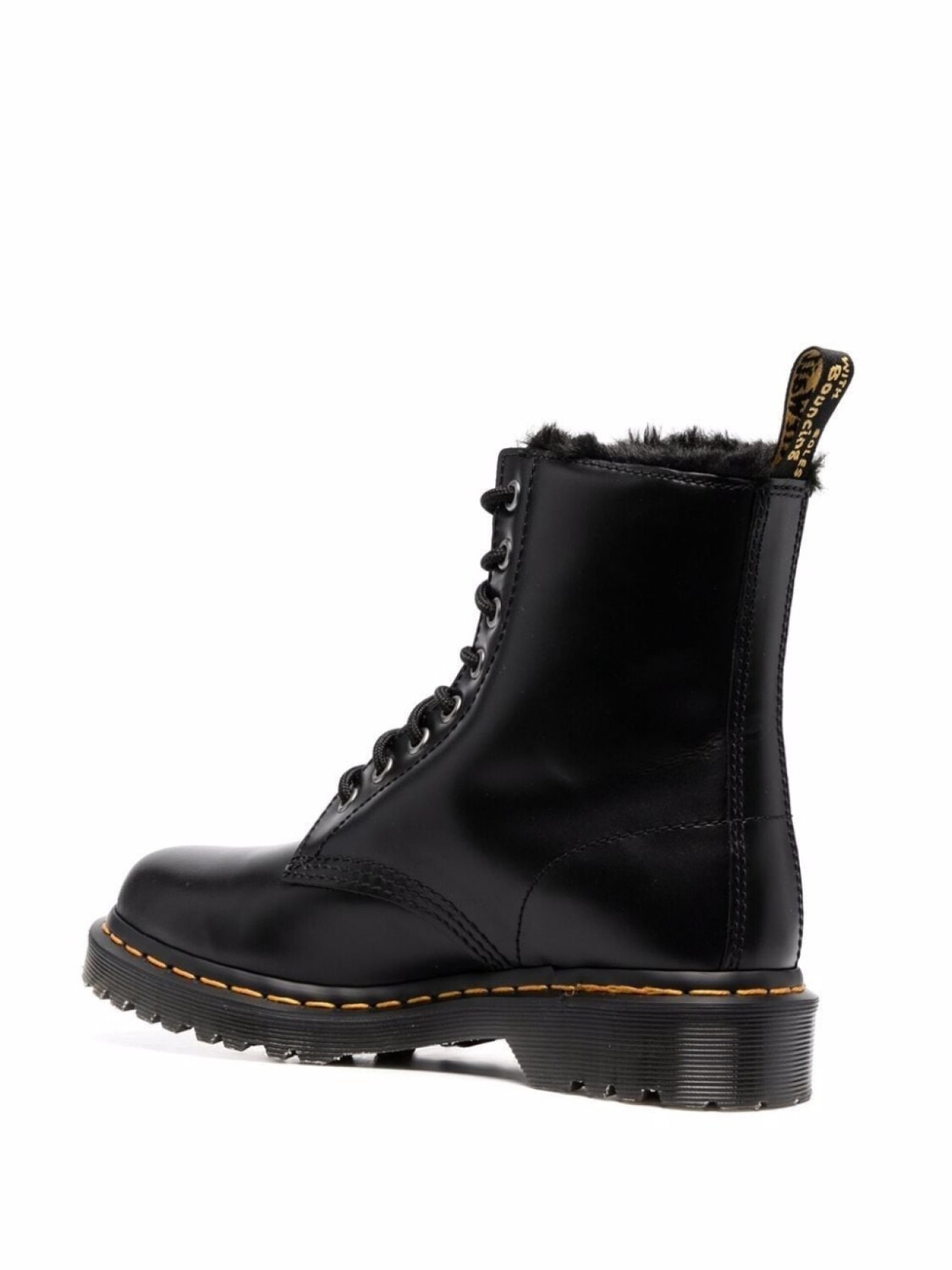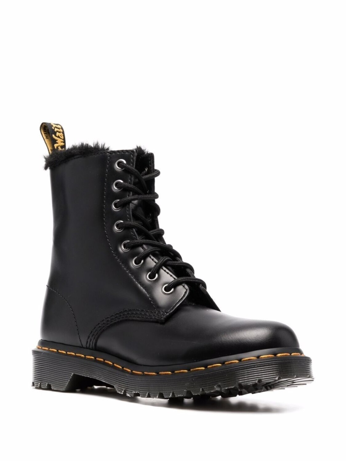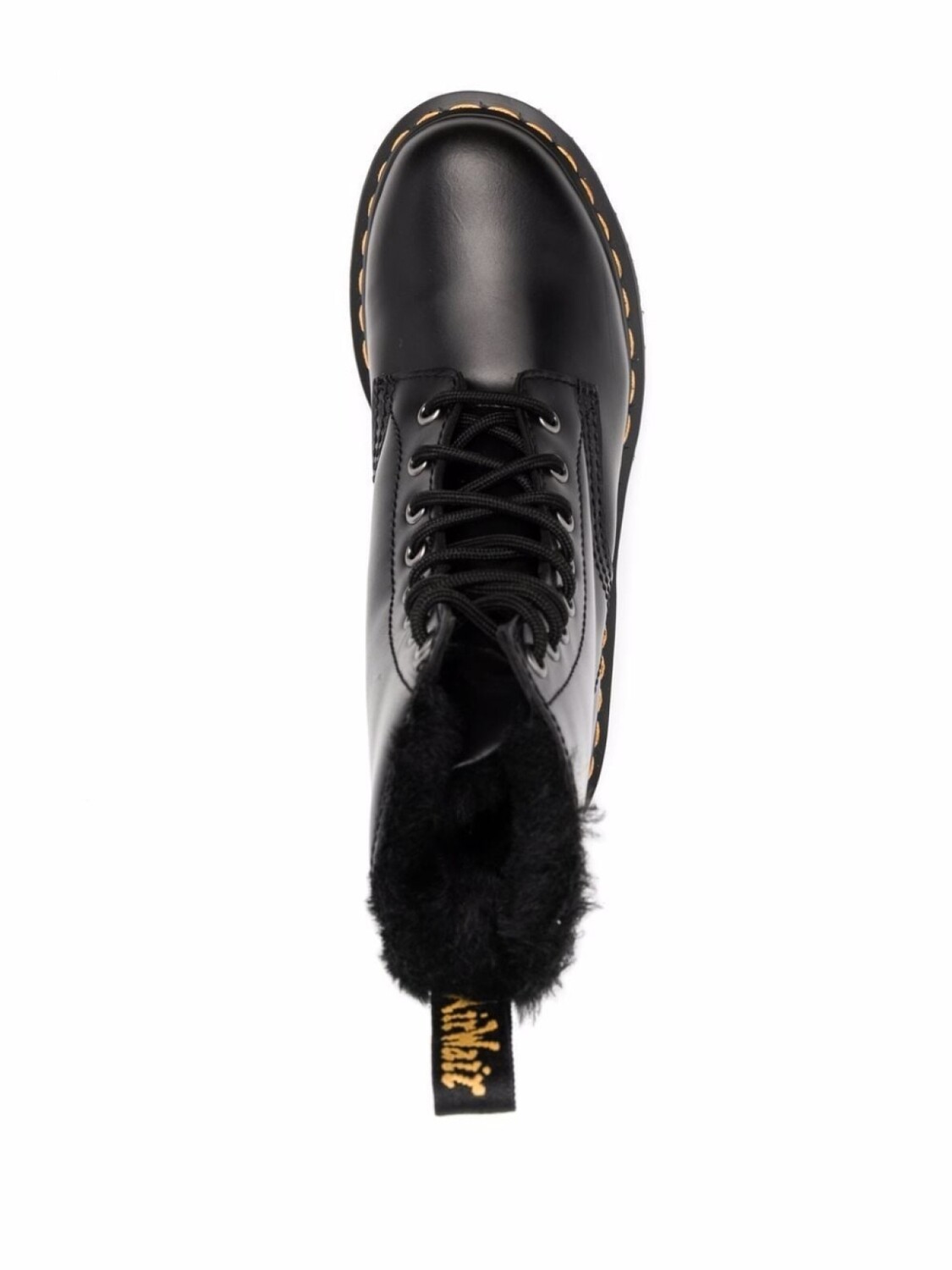 Подкладка из искусственной овчины, закругленный носок, шнуровка спереди, петля для подтягивания сзади, ребристая резиновая подошва и длина до середины икры.