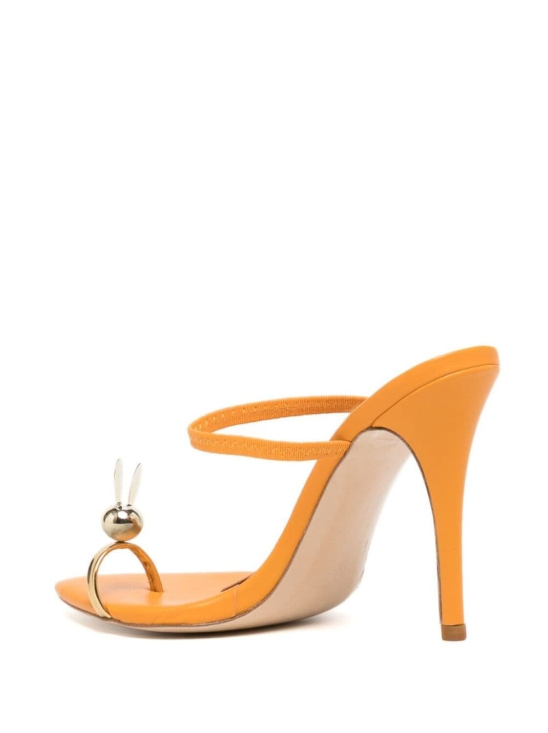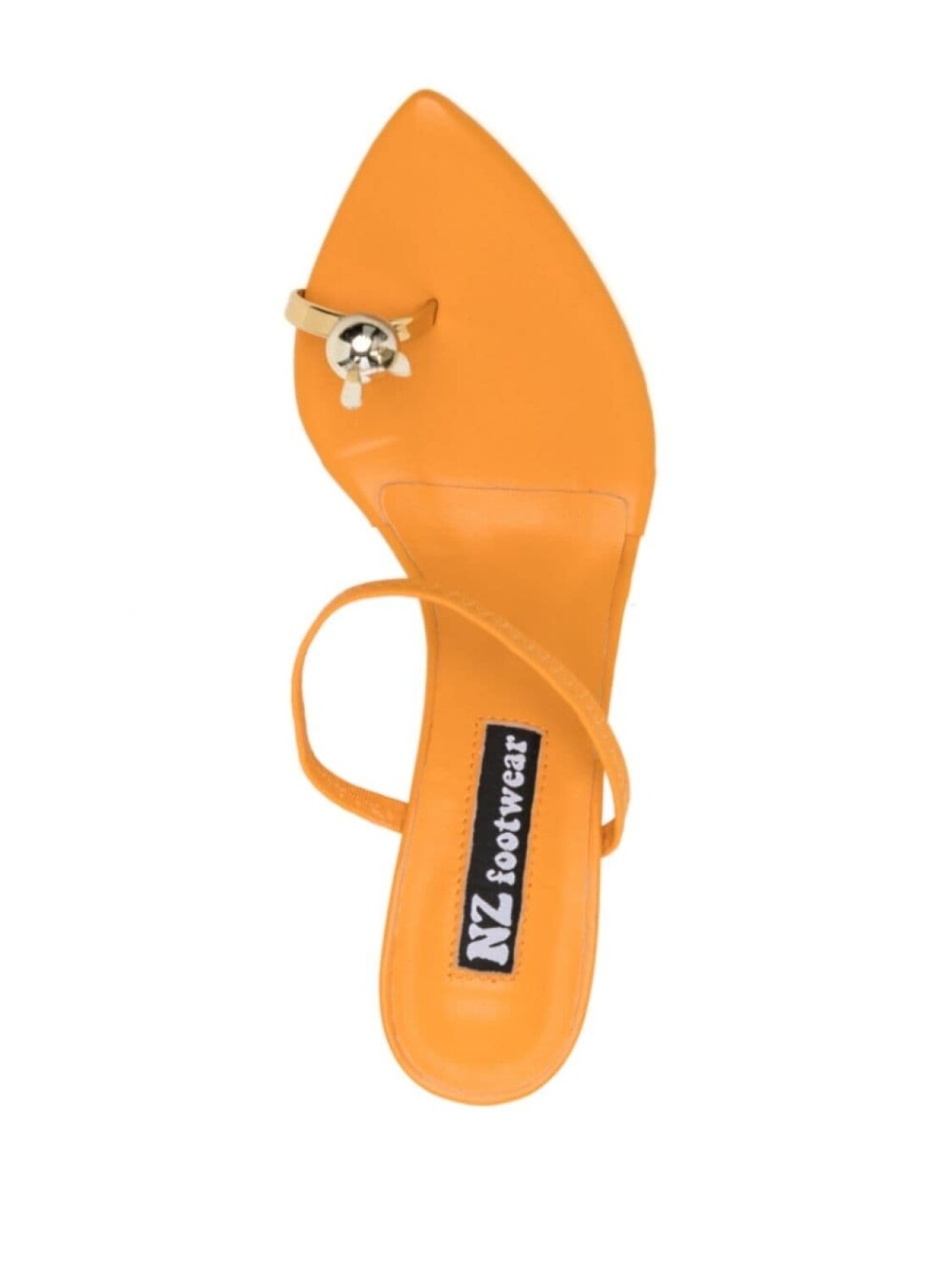 Оранжевый, золотистый, телячья кожа, аппликация, стелька с логотипом, открытый носок, заостренный носок, ремешок на палец, эластичная резинка, модель без застежки и каблук на высокой шпильке.