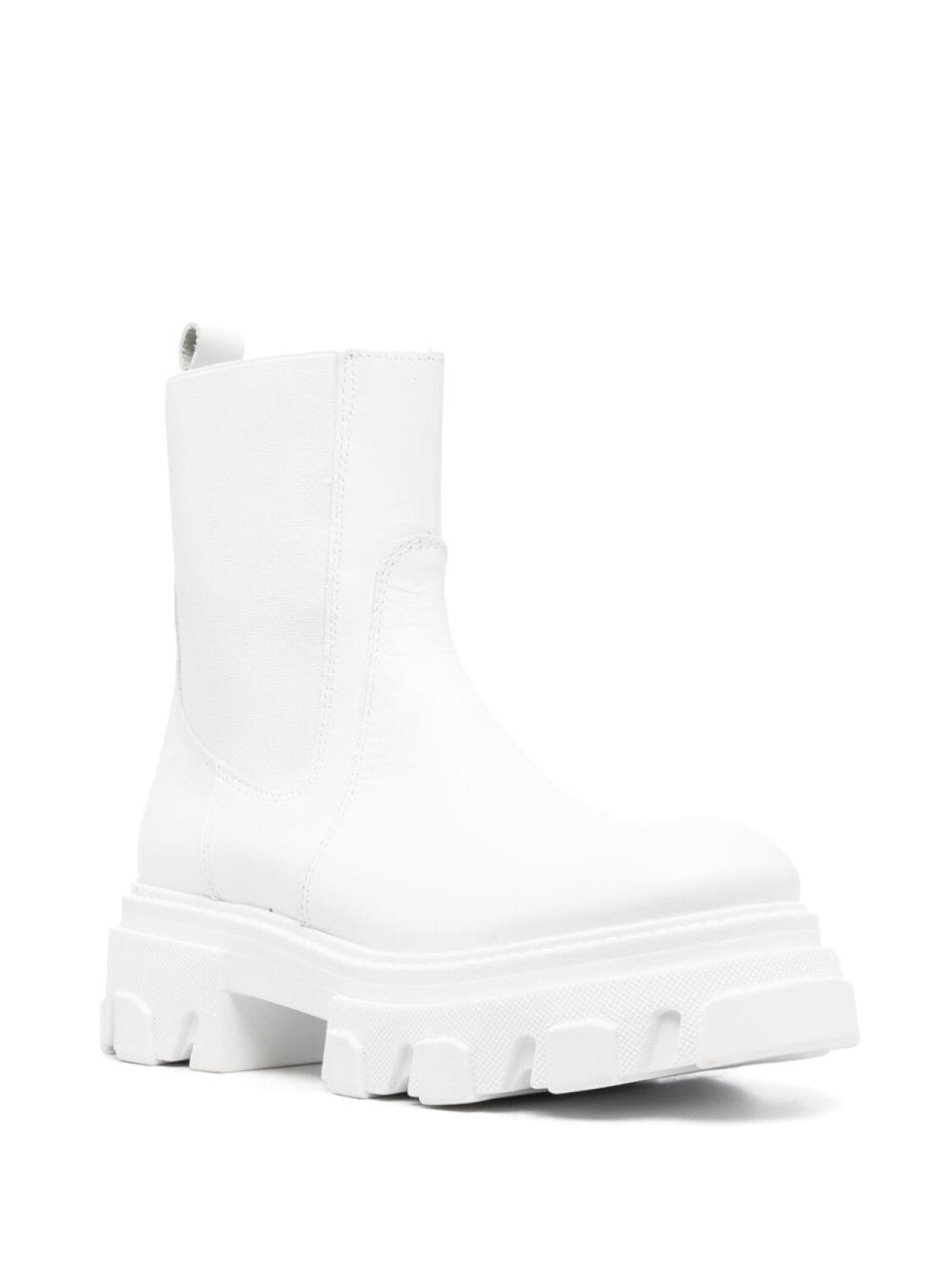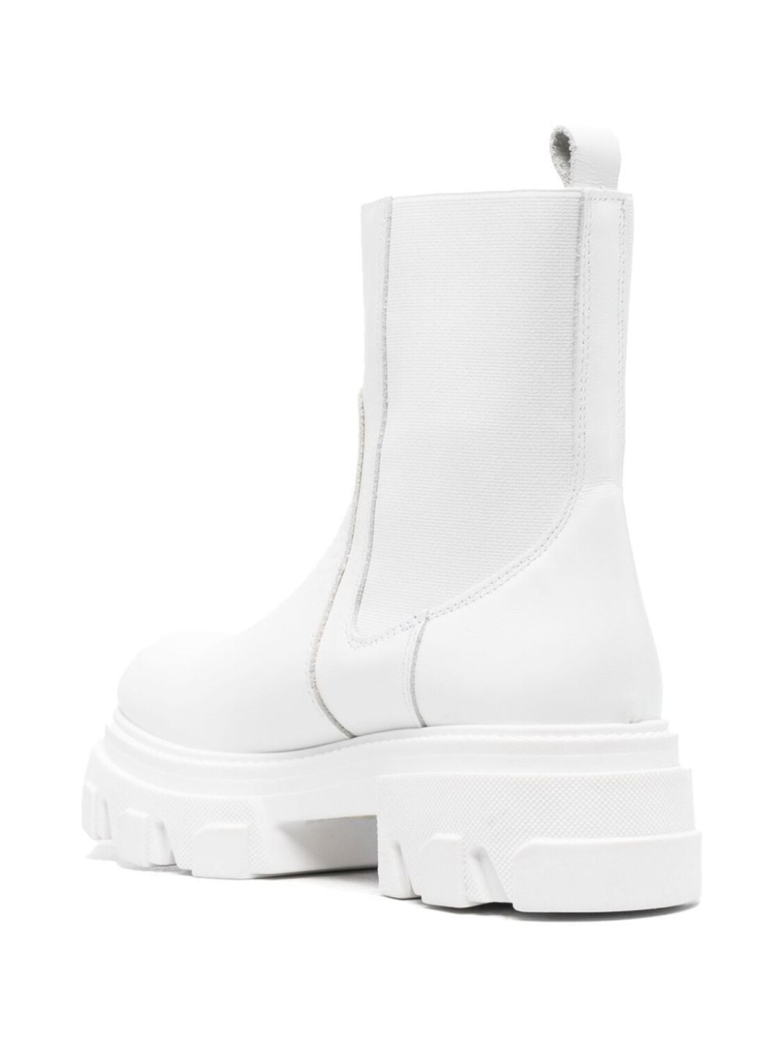 Расцветка Cloud White, телячья кожа, детали в рубчик, эластичные вставки, петля для подтягивания сзади, стелька с логотипом, закругленный носок, подошва на платформе, блочный каблук средней высоты, высота по щиколотку и модель без застежки.