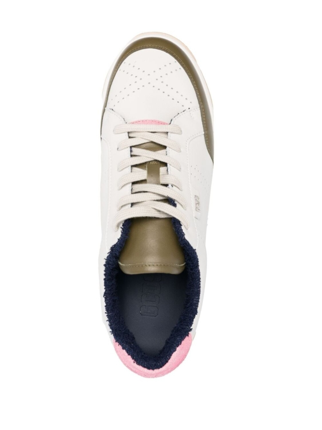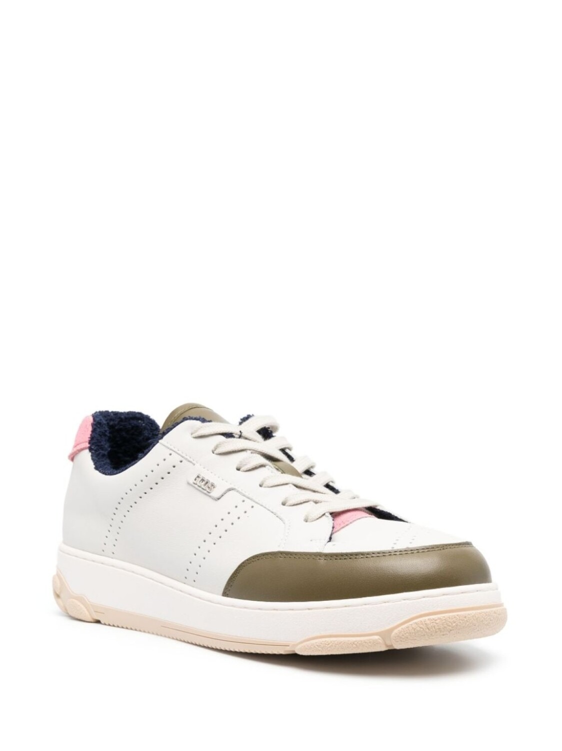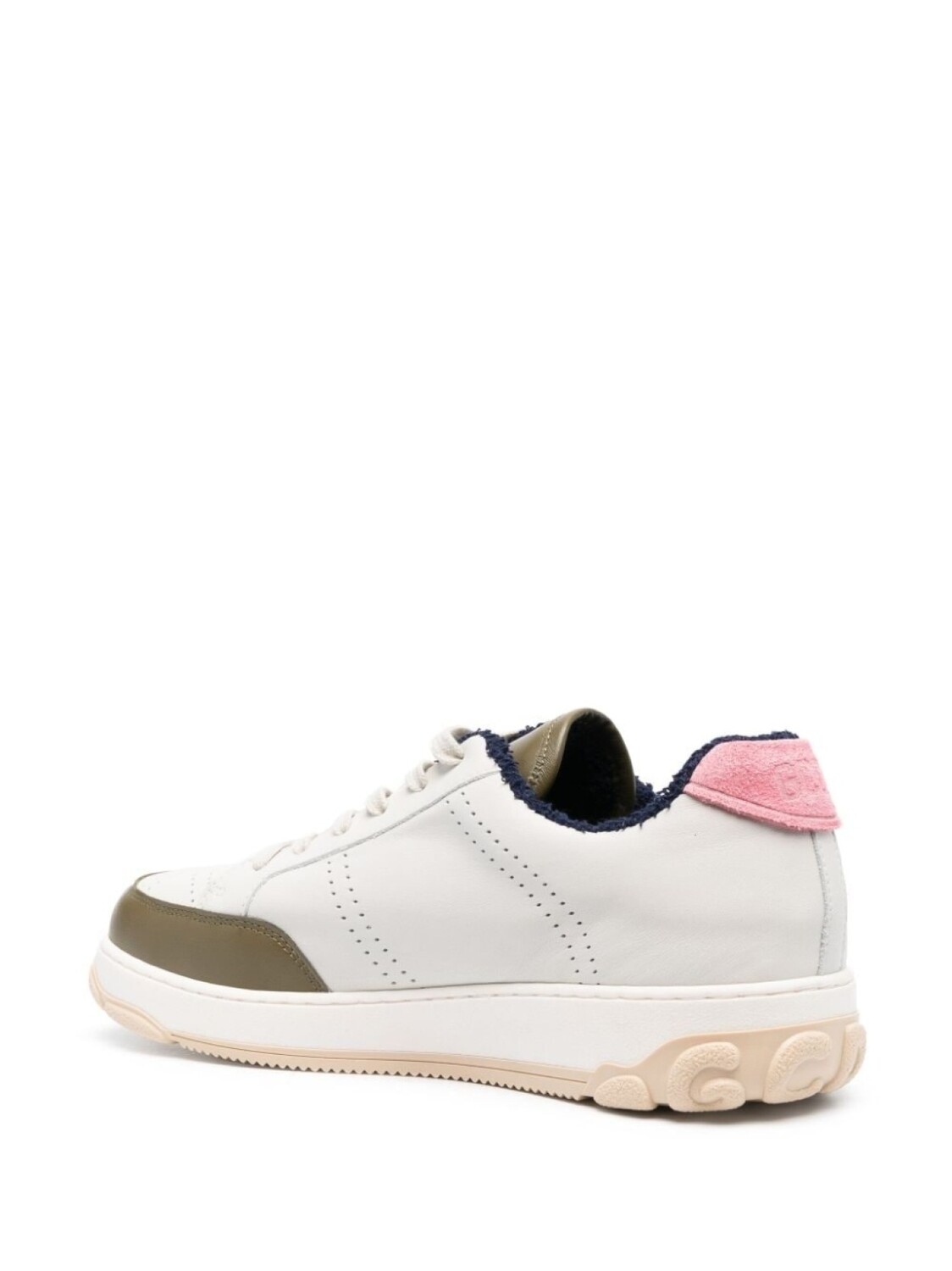Белый/разноцветный, телячья кожа, тисненый логотип сзади, логотип на подошве, перфорация, закругленный носок, шнуровка спереди, стелька с логотипом и контрастная резиновая подошва.