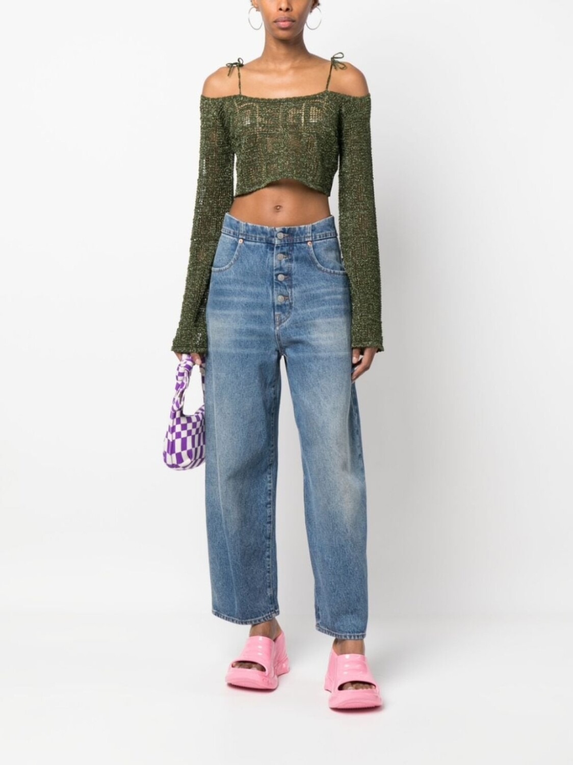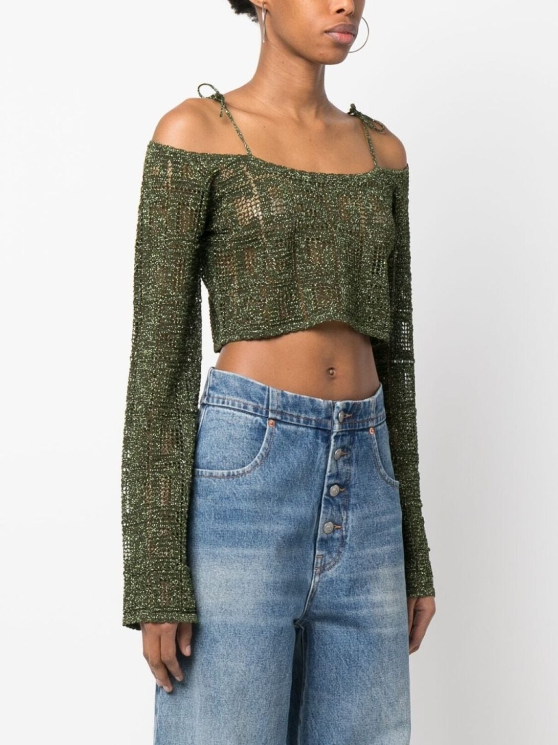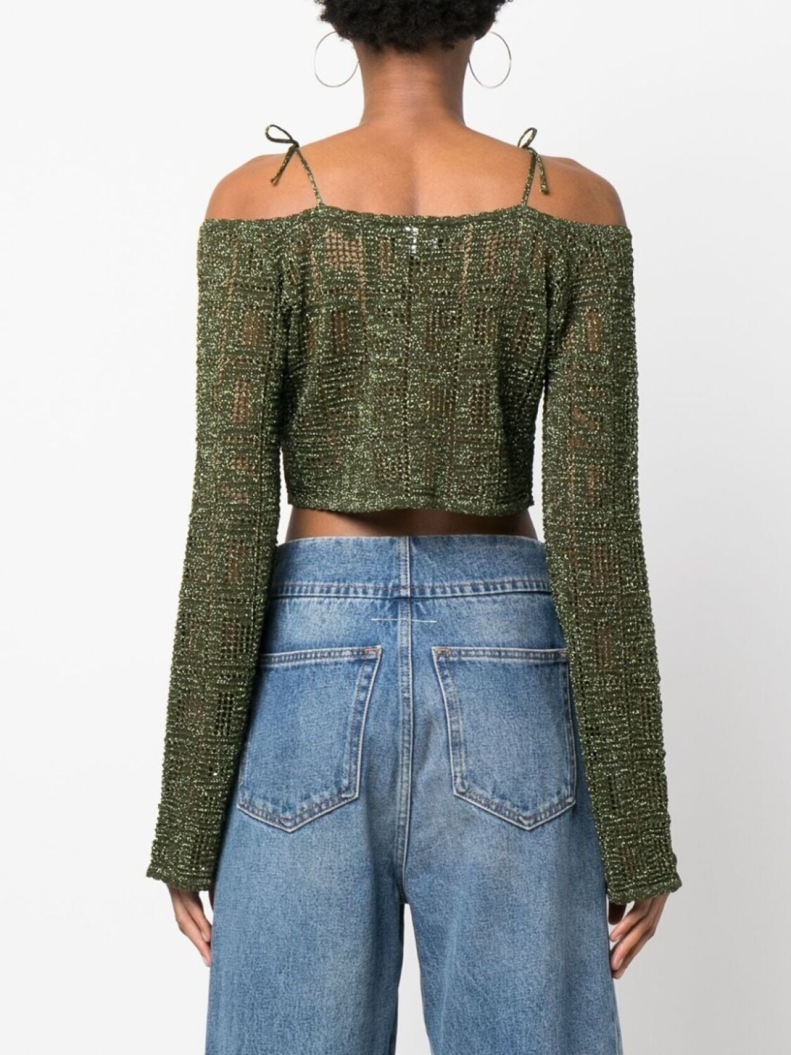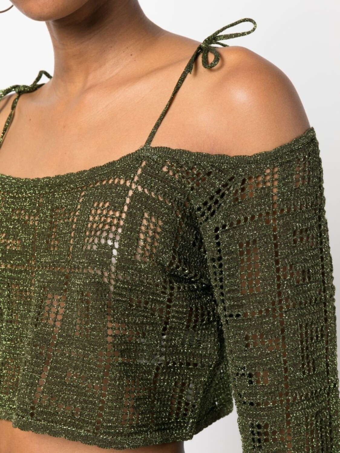 Хаки, полупрозрачный дизайн, люрекс, отделка в технике макраме, открытые плечи, завязки вокруг шеи, длинные рукава и укороченная длина.