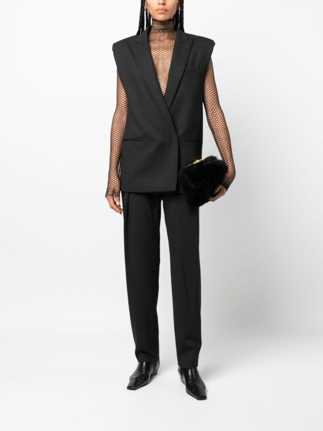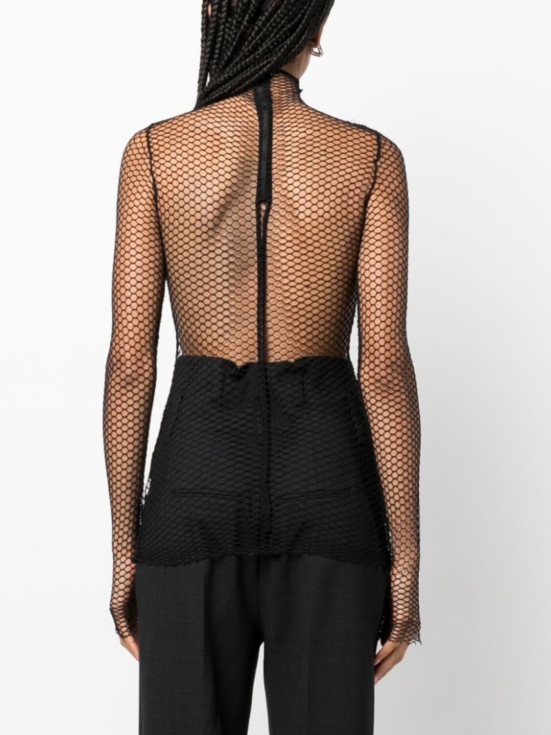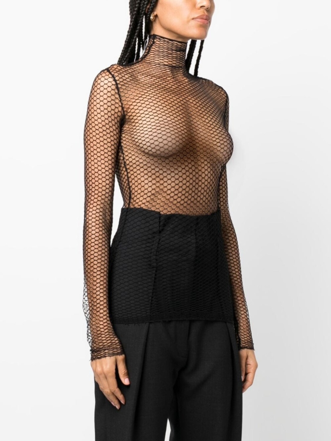 Черный, эластичный материал, высокий воротник, длинные рукава и сетчатый дизайн.