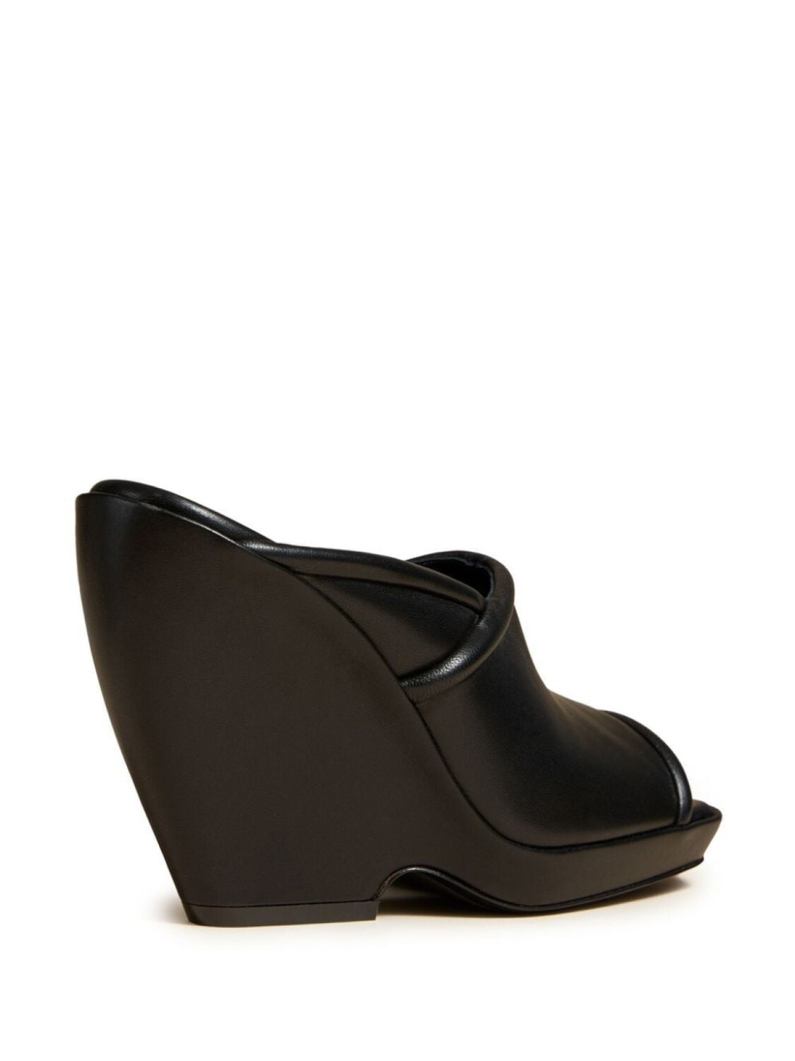 Черный, телячья кожа, открытый носок, модель без застежки и высокая танкетка.