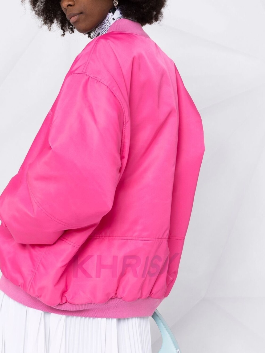 цвет: розовый дутый материал двухцветная деталь принт с логотипом сзади бейсбольный воротник застежка на молнии спереди длинные рукава эластичные манжеты два вшитых кармана по бокам эластичный подол