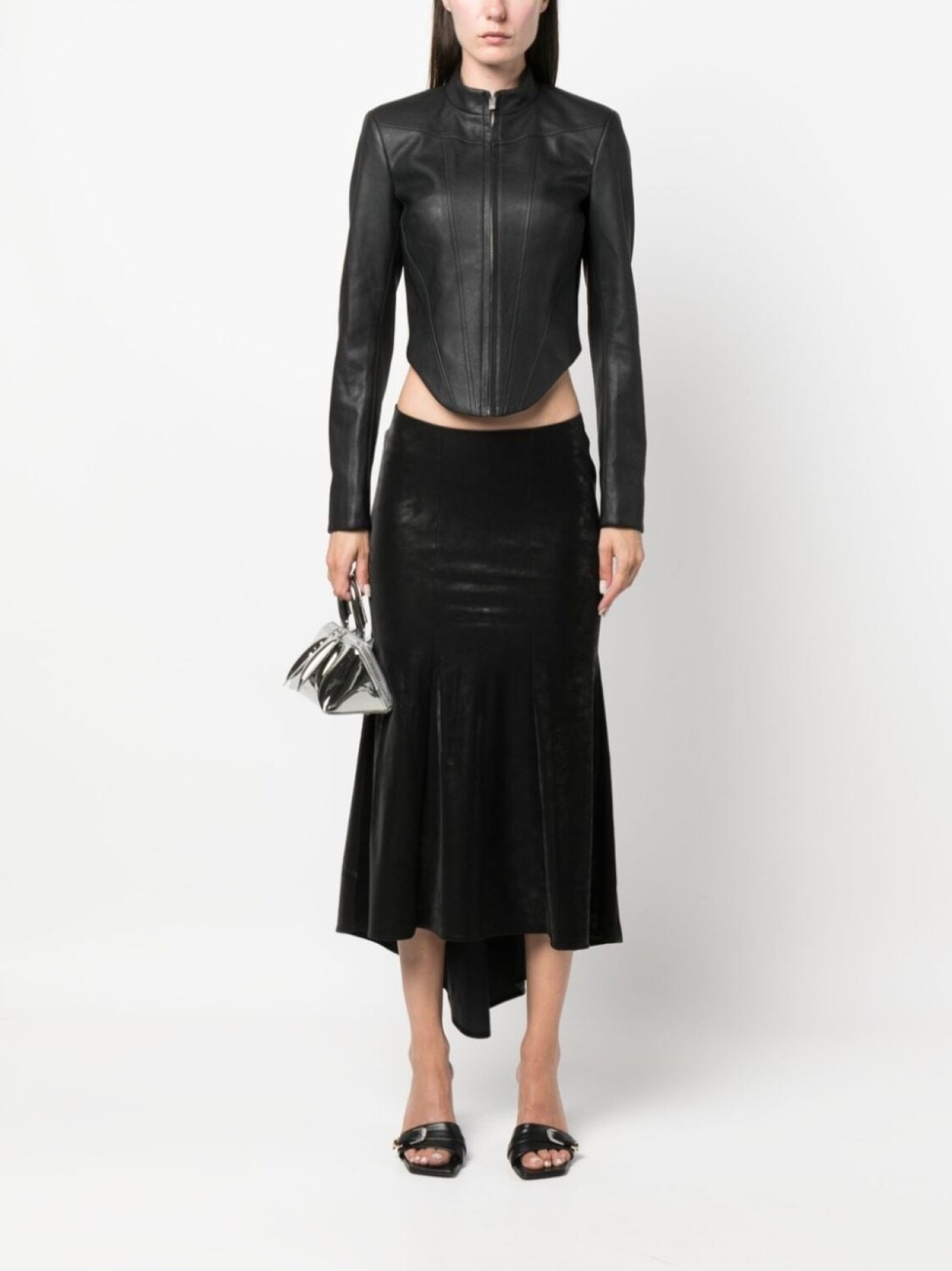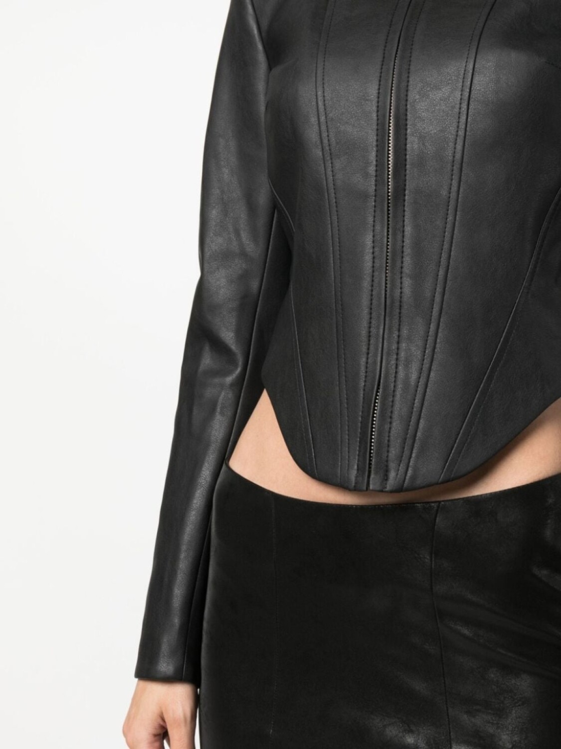 Черный, искусственная кожа, верх в корсетном стиле, укороченная длина, высокий воротник, застежка на молнии спереди, длинные рукава и закругленный подол.