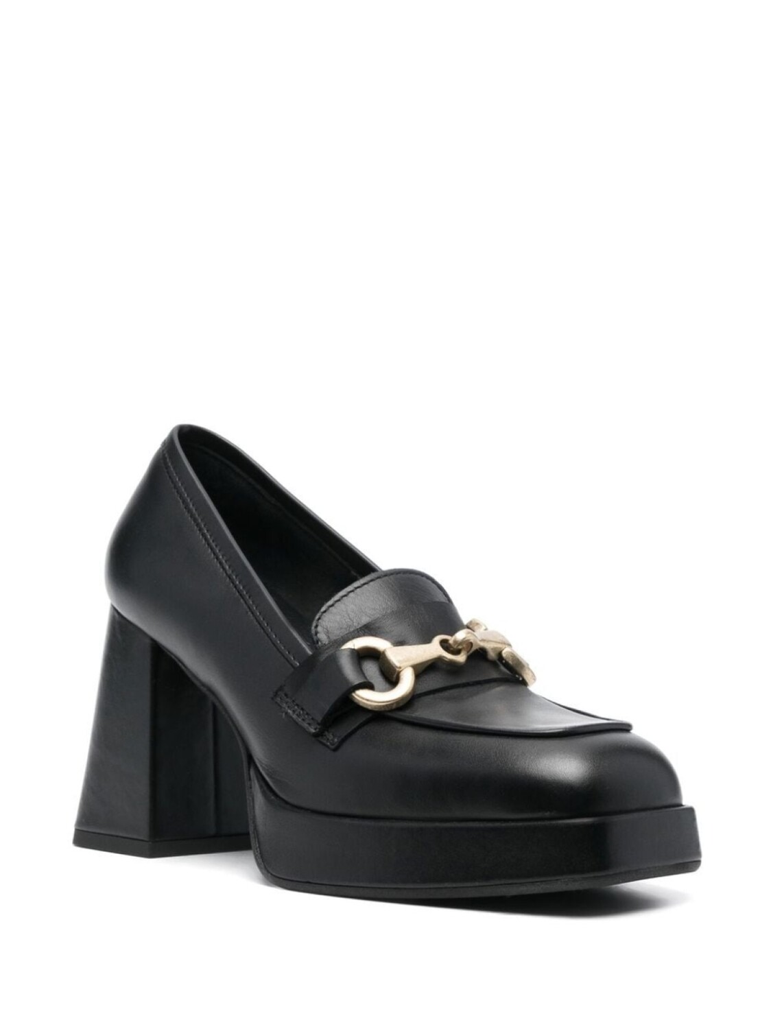 Черный, телячья кожа, золотистая фурнитура, квадратный носок, кожаная стелька с логотипом, высокий блочный каблук и модель без застежки.