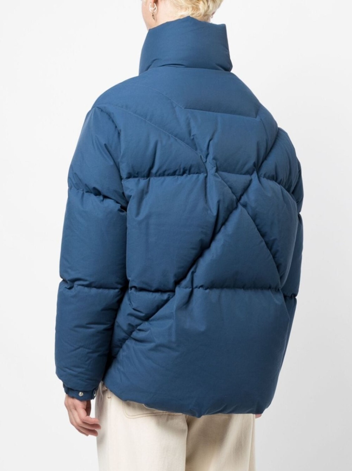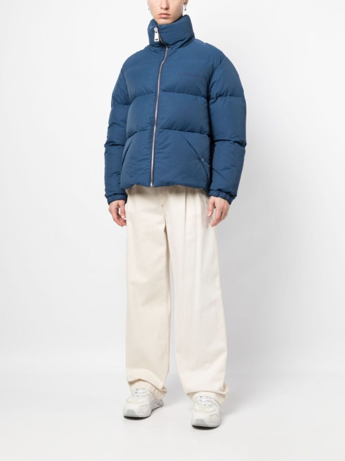 Кобальтово-синий, наполнитель из смеси пуха и пера, дутый материал, принт с логотипом на груди, воротник-труба, застежка на молнии спереди, длинные рукава, эластичные манжеты, два кармана на кнопке по бокам и прямой подол.