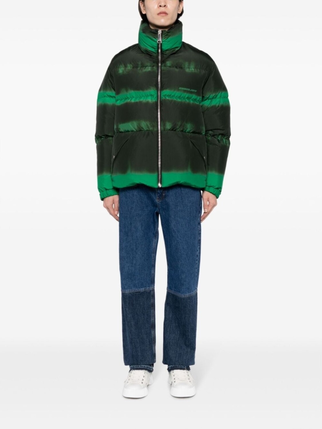 Расцветка Grass Green, наполнитель из смеси пуха и пера, дутый материал, эффект потертости, принт с логотипом на груди, воротник-труба, застежка на молнии спереди, два боковых кармана с застежкой на кнопки, длинные рукава, эластичные манжеты, манжеты с застежкой на кнопки и прямой подол.