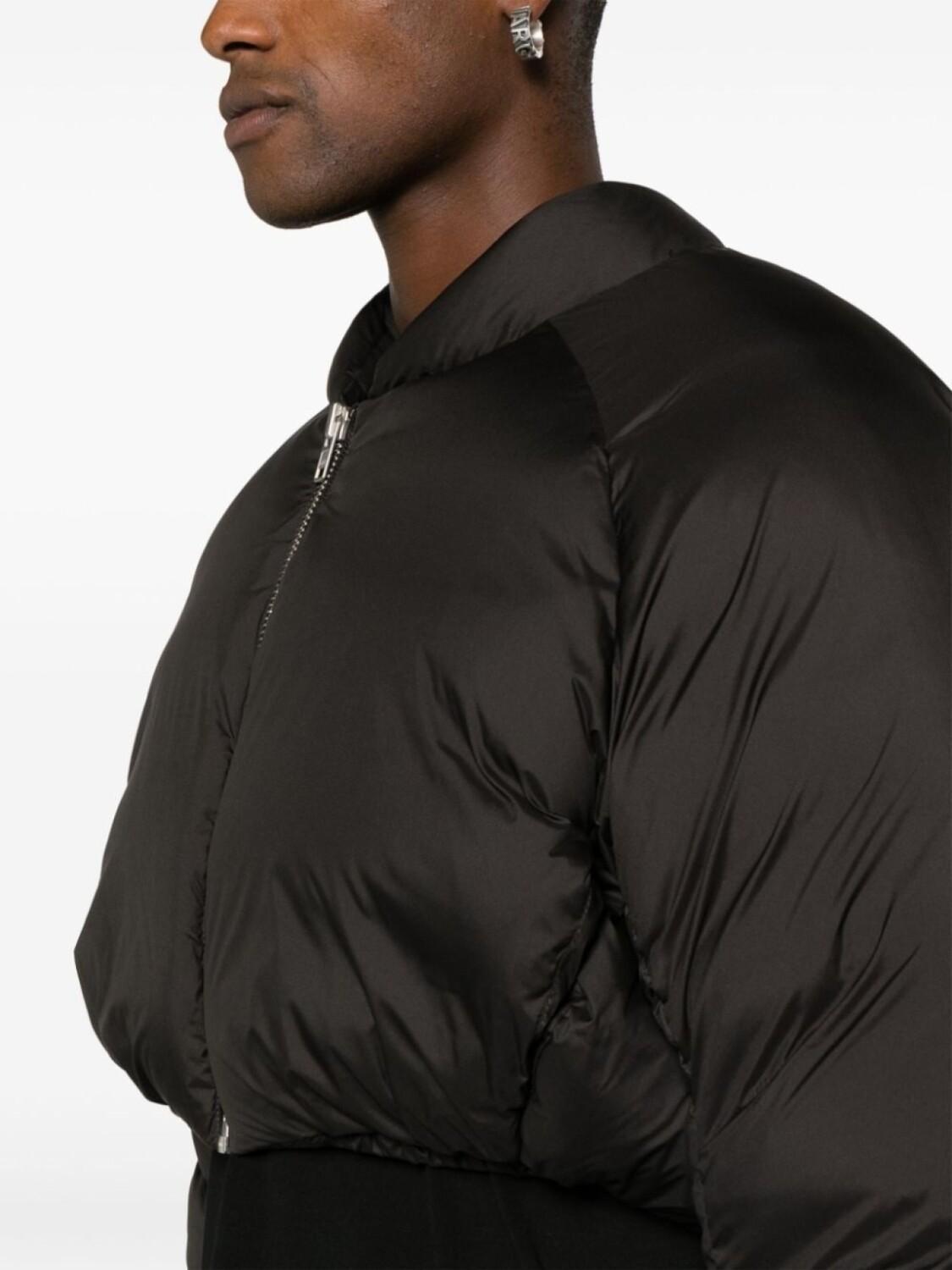 черный, утиный пух, дутый материал, бейсбольный воротник, застежка на молнии спереди, длинные рукава, манжеты в рубчик, два вшитых кармана по бокам, эластичный пояс на шнурке, внутренние карманы на молнии, цельная подкладка, прямой подол, укороченная длина