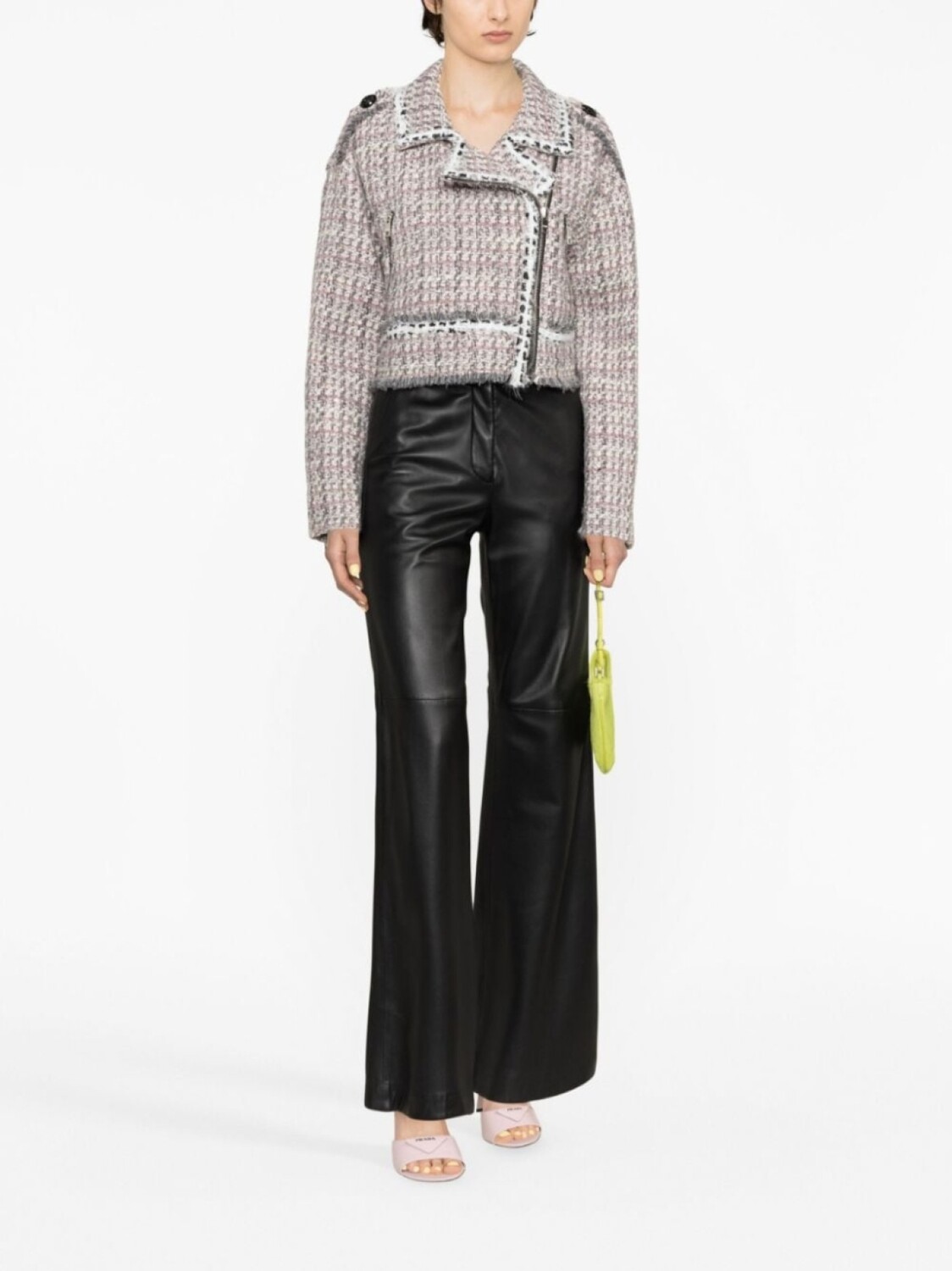 Пудрово-розовый, твидовая ткань, косой воротник, смещенная застежка на молнии спереди, длинные рукава, два кармана на молнии по бокам и укороченная длина.