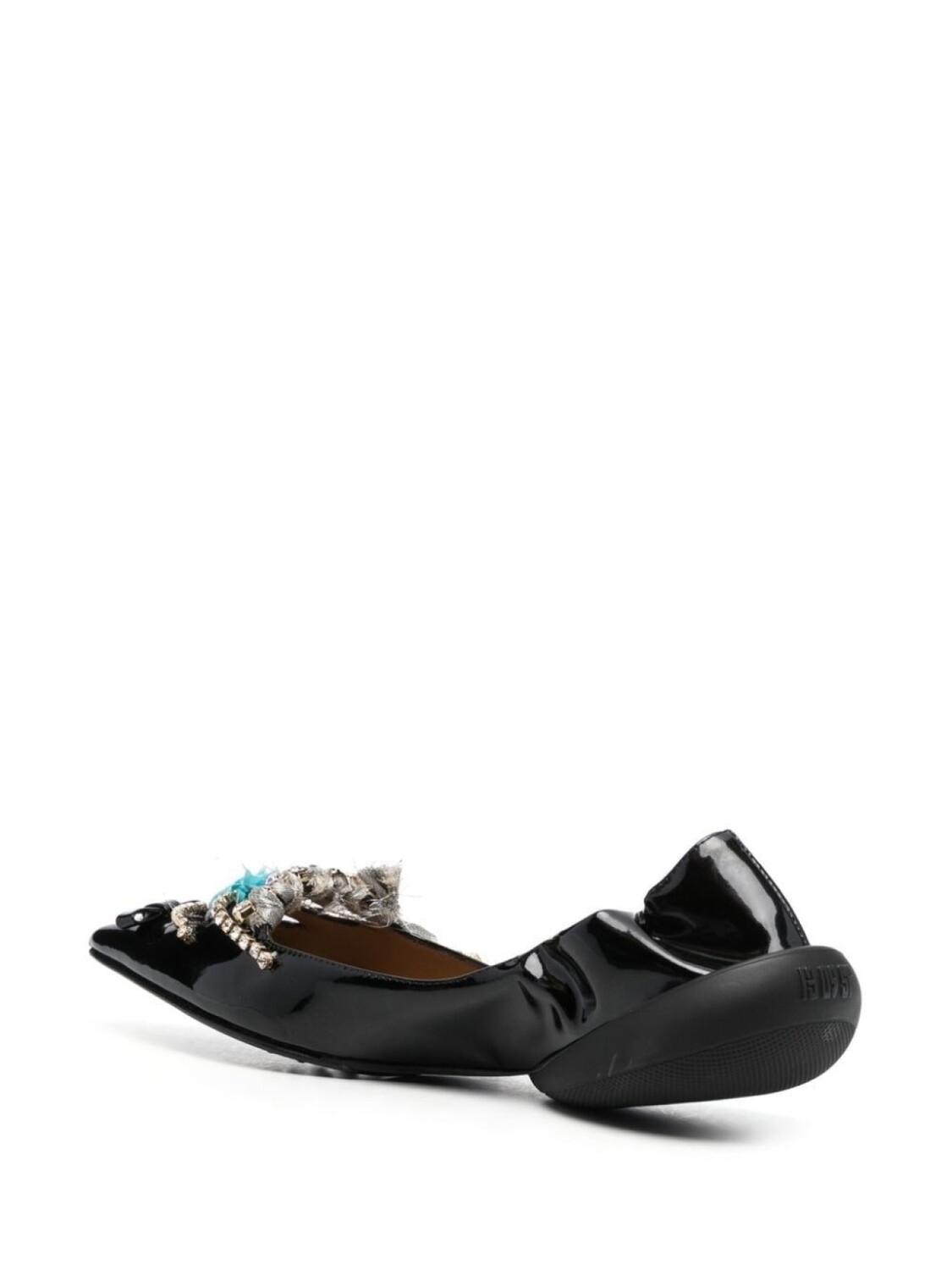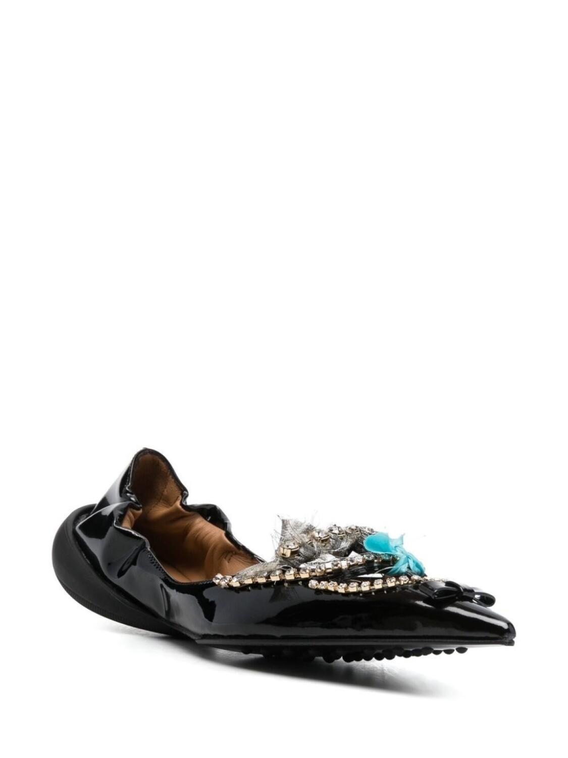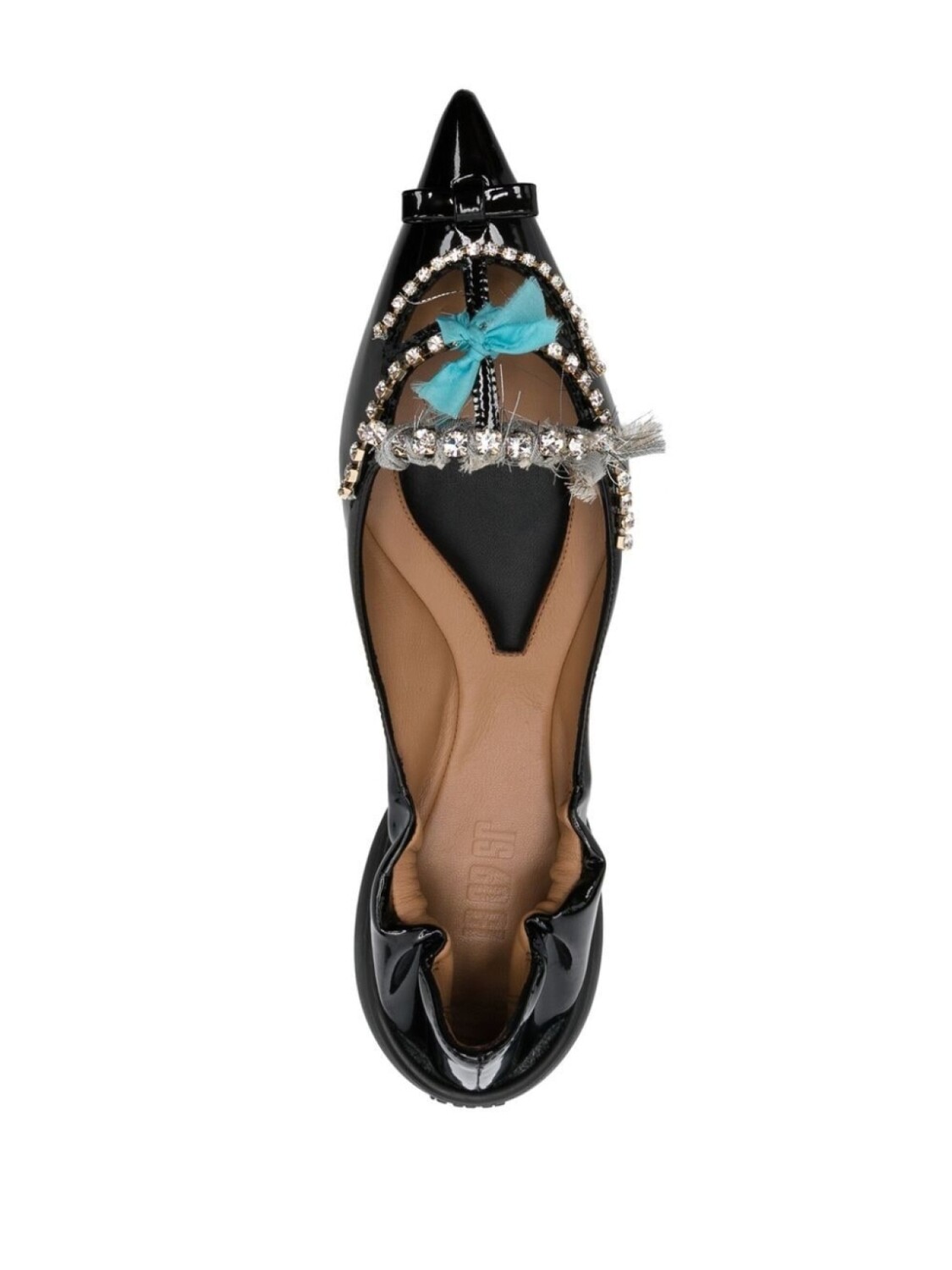 Черный, телячья кожа, лакированная отделка, декор из кристаллов, бант, заостренный носок и низкий каблук.