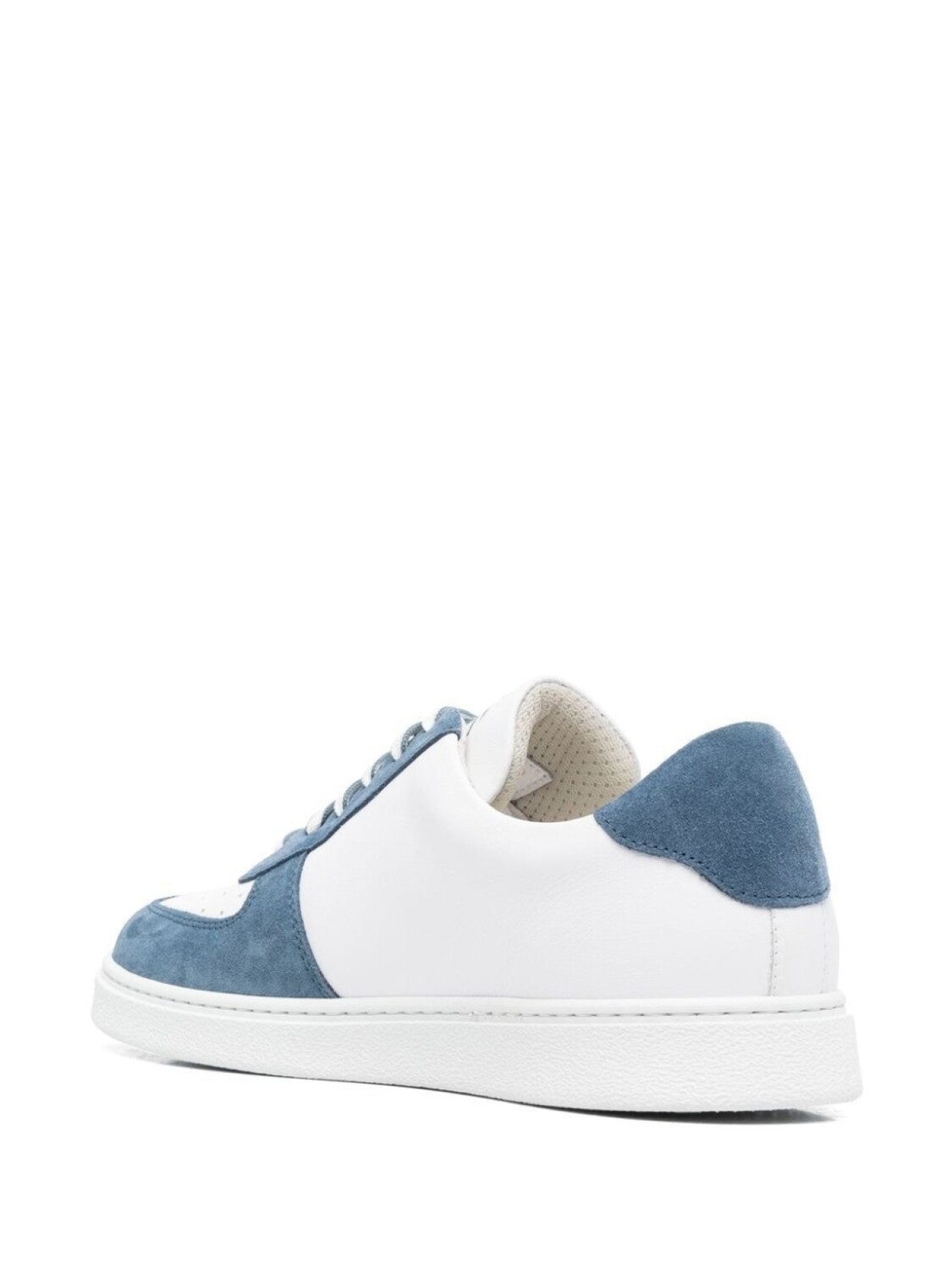 Белый, синий, розовый, телячья кожа, стиль колор-блок, узор Pegaso, логотип сбоку, перфорированный носок, язычок с логотипом, шнуровка спереди, кожаная стелька с логотипом, закругленный носок и плоская резиновая подошва.