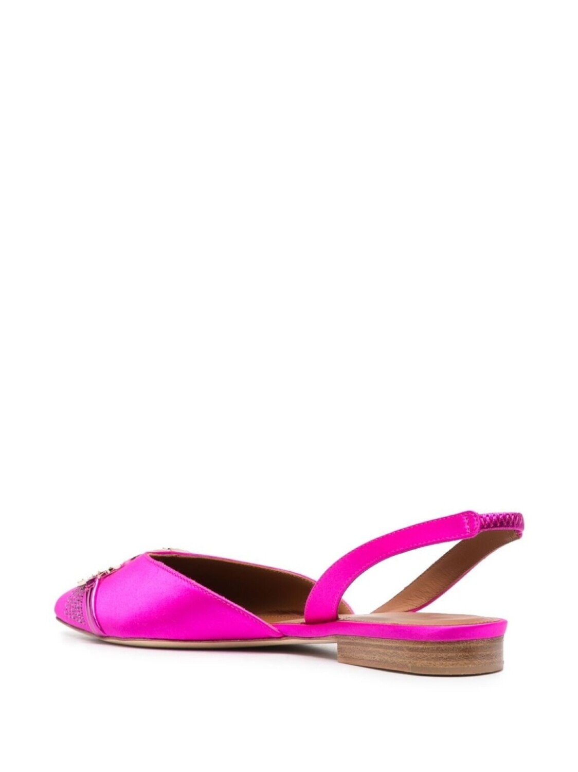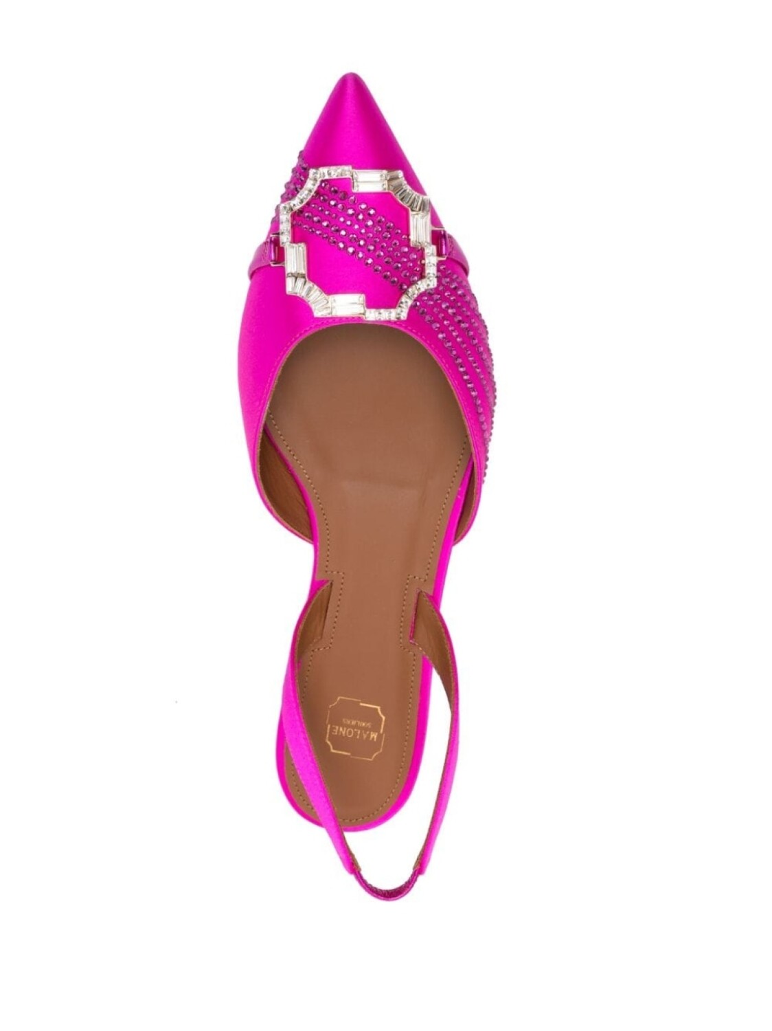 Фуксия, декор из кристаллов, декоративная пряжка, ремешок на пятке, стелька с логотипом, плоская подошва и заостренный носок.