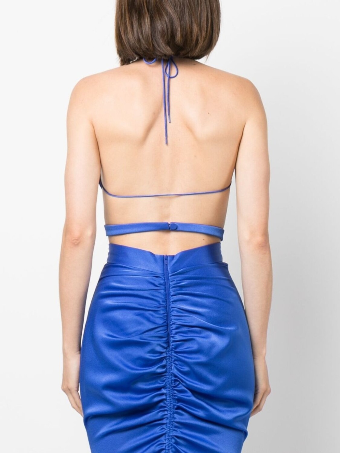 Синий, креповая текстура, вырезные детали, несколько оборотов, V-образный вырез, завязки вокруг шеи, застежка на крючок сзади и без рукавов.