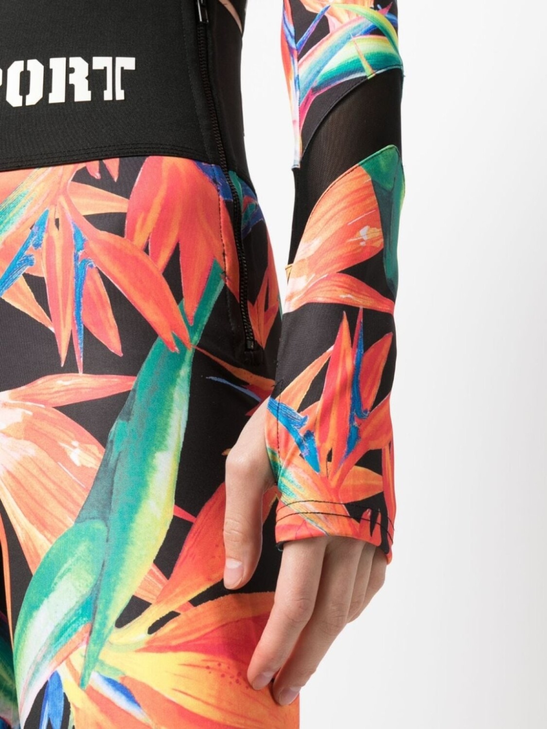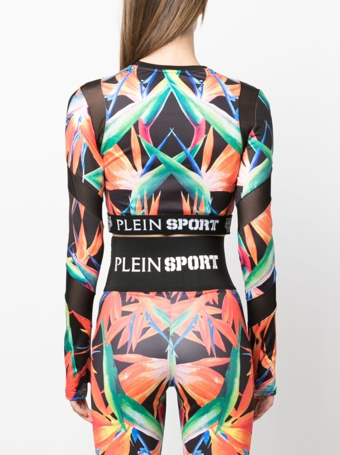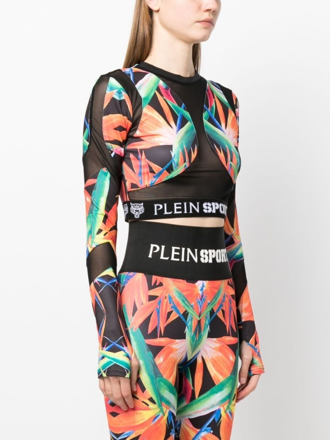 Черный, разноцветный, эластичный материал, принт с изображением растений, полупрозрачные вставки, круглый вырез, длинные рукава, пояс с логотипом и укороченная длина.