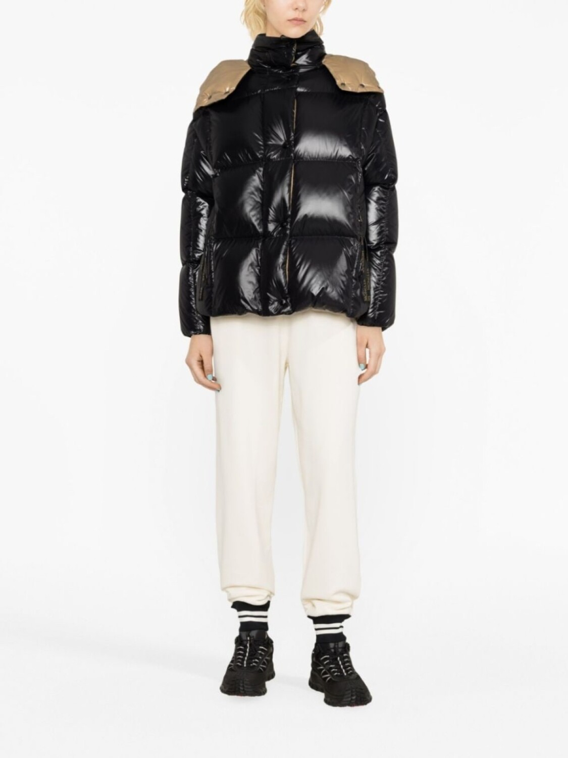 Черный, наполнитель из смеси пуха и пера, дутый материал, стеганая модель, съемный капюшон, нашивка с логотипом на рукаве, застежка на кнопки и молнию спереди, длинные рукава, два кармана на молнии по бокам и прямой подол.