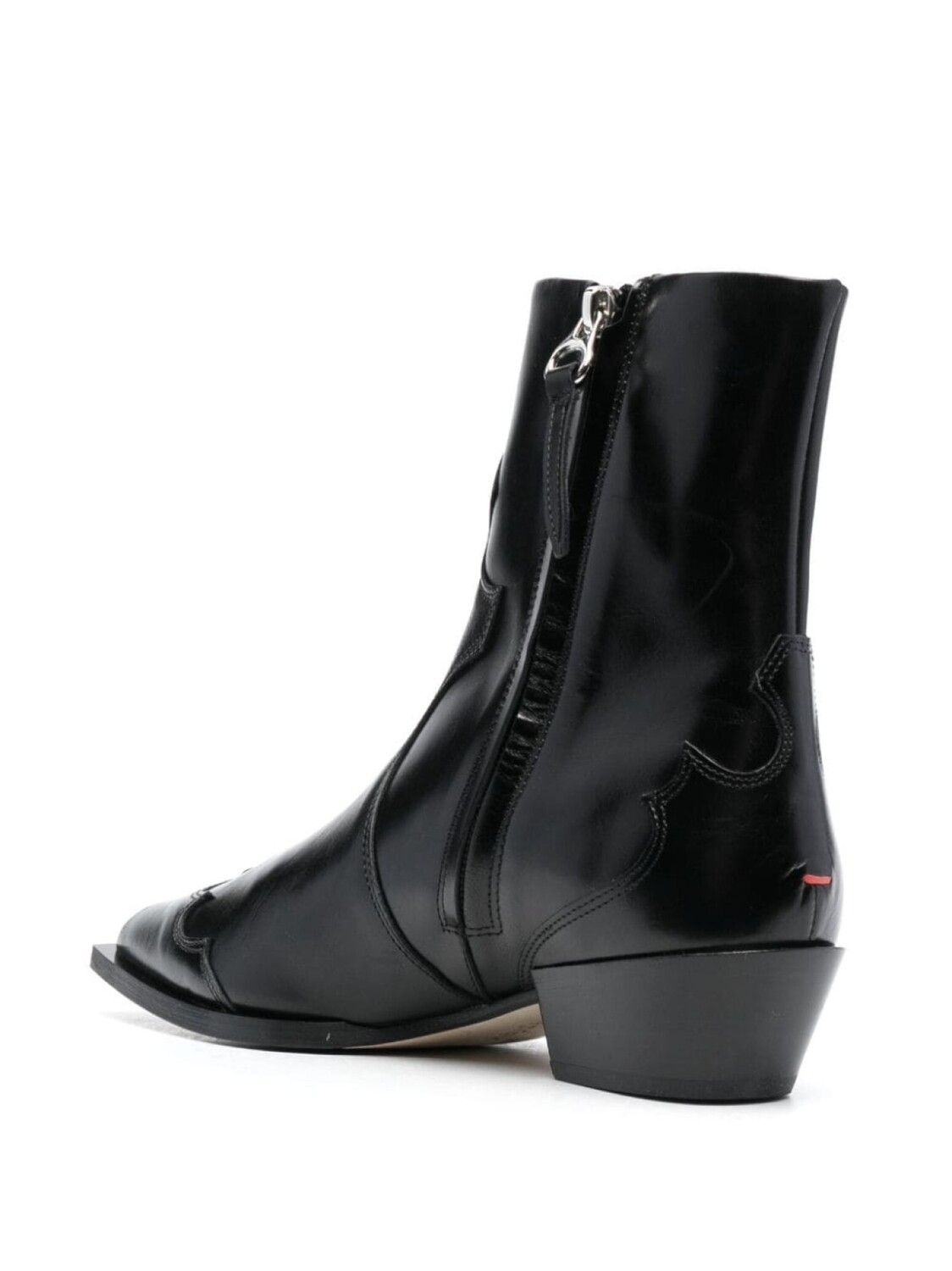 Черный, телячья кожа, строчка в тон, заостренный носок, застежки на молнии сбоку, кожаная стелька с логотипом, блочный каблук, кожаная подошва, резиновая подошва и высота по щиколотку.