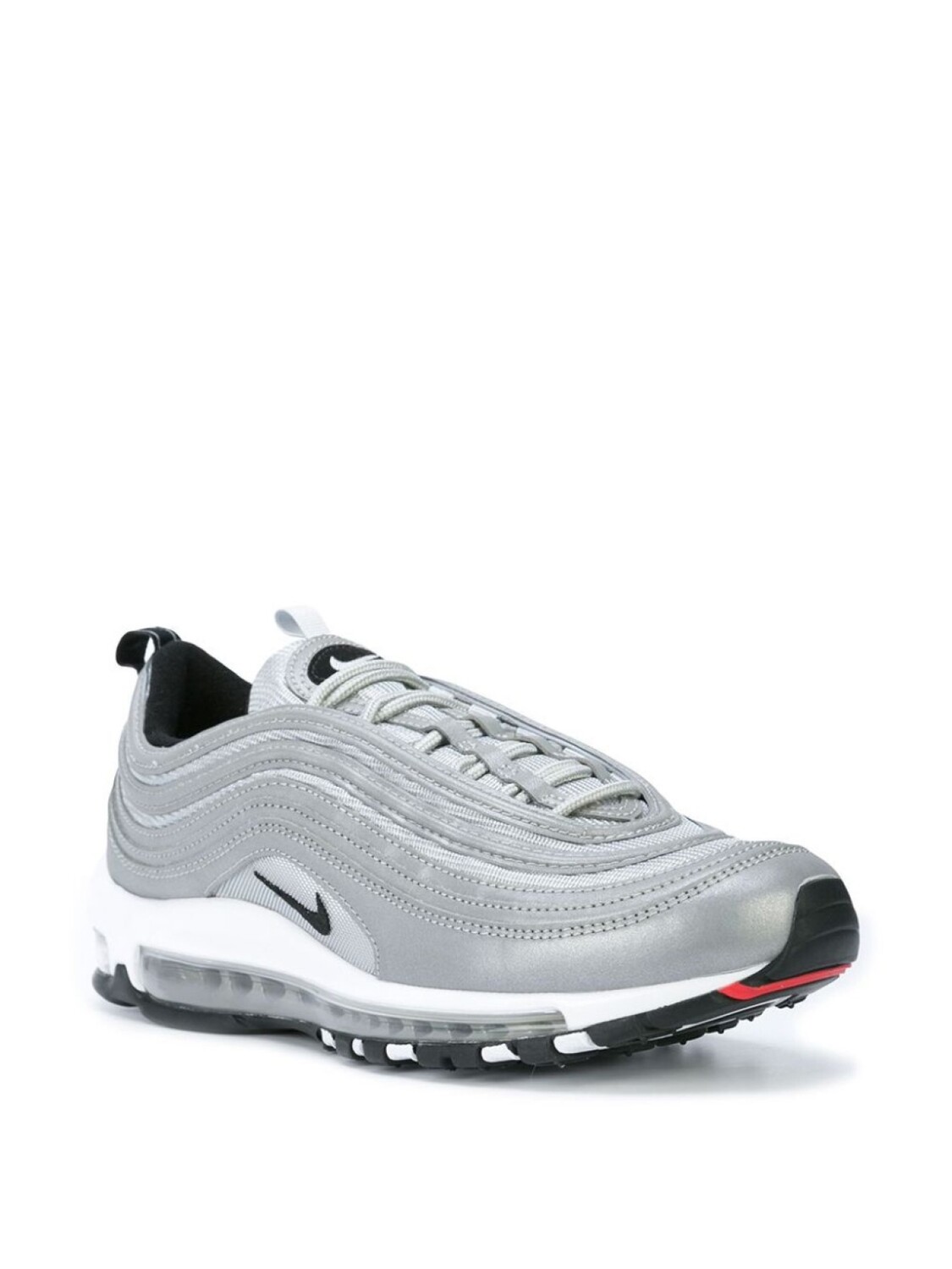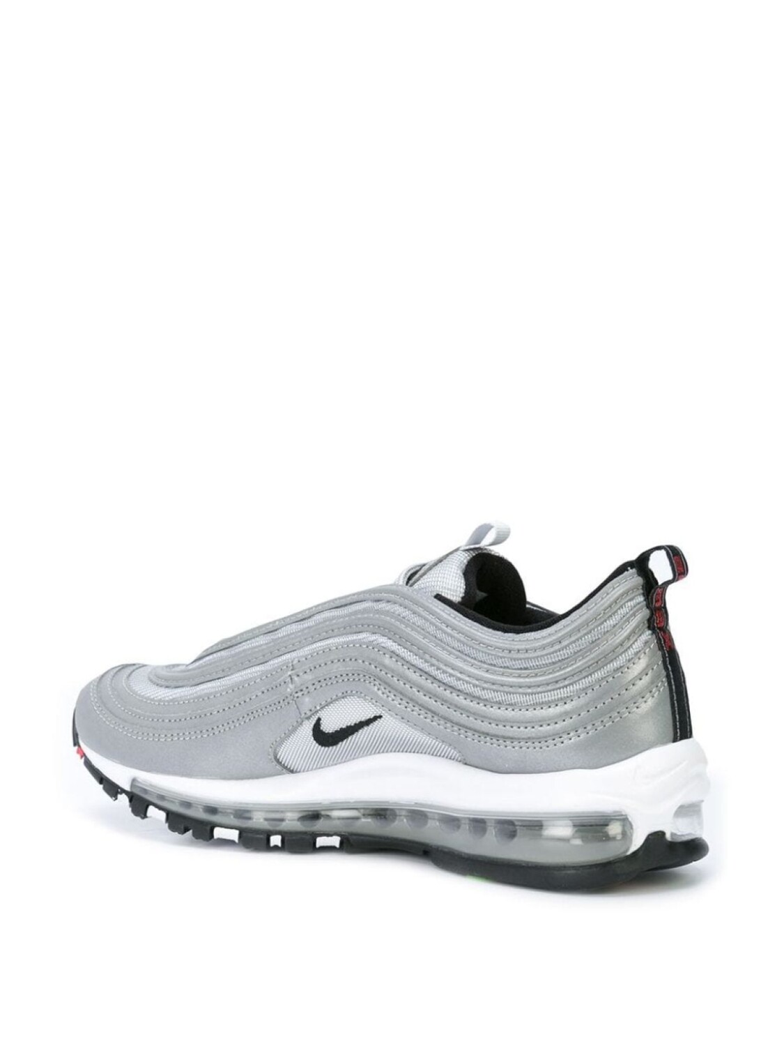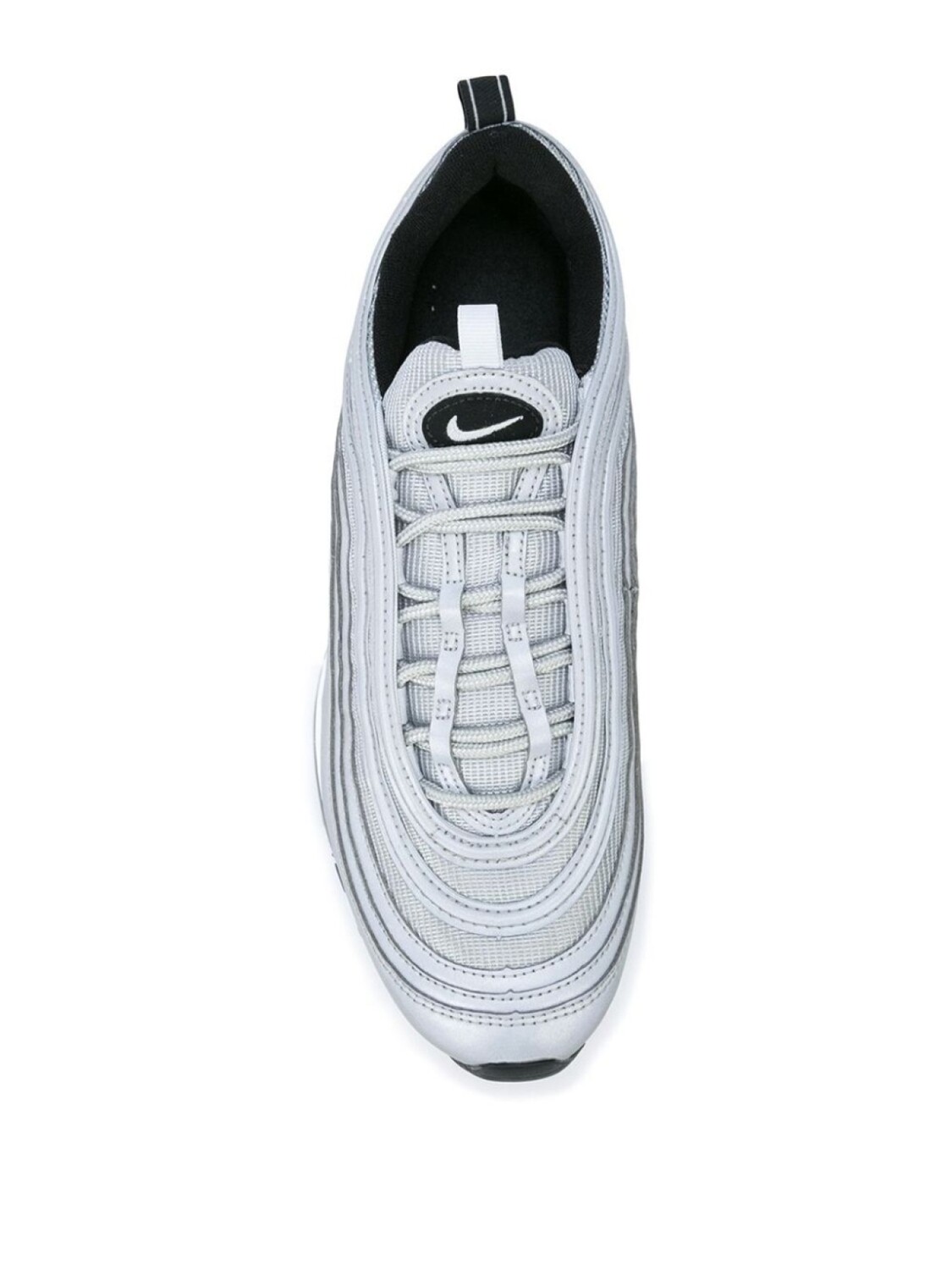 Серебристые с черным кроссовки 'Air Max 97 Premium' с кожаной отделкой от Nike(Найк). Закругленный носок, шнуровка спереди, заплатка с логотипом на язычке, фирменная стелька, уплотненная щиколотка, фирменная галочка Nike.