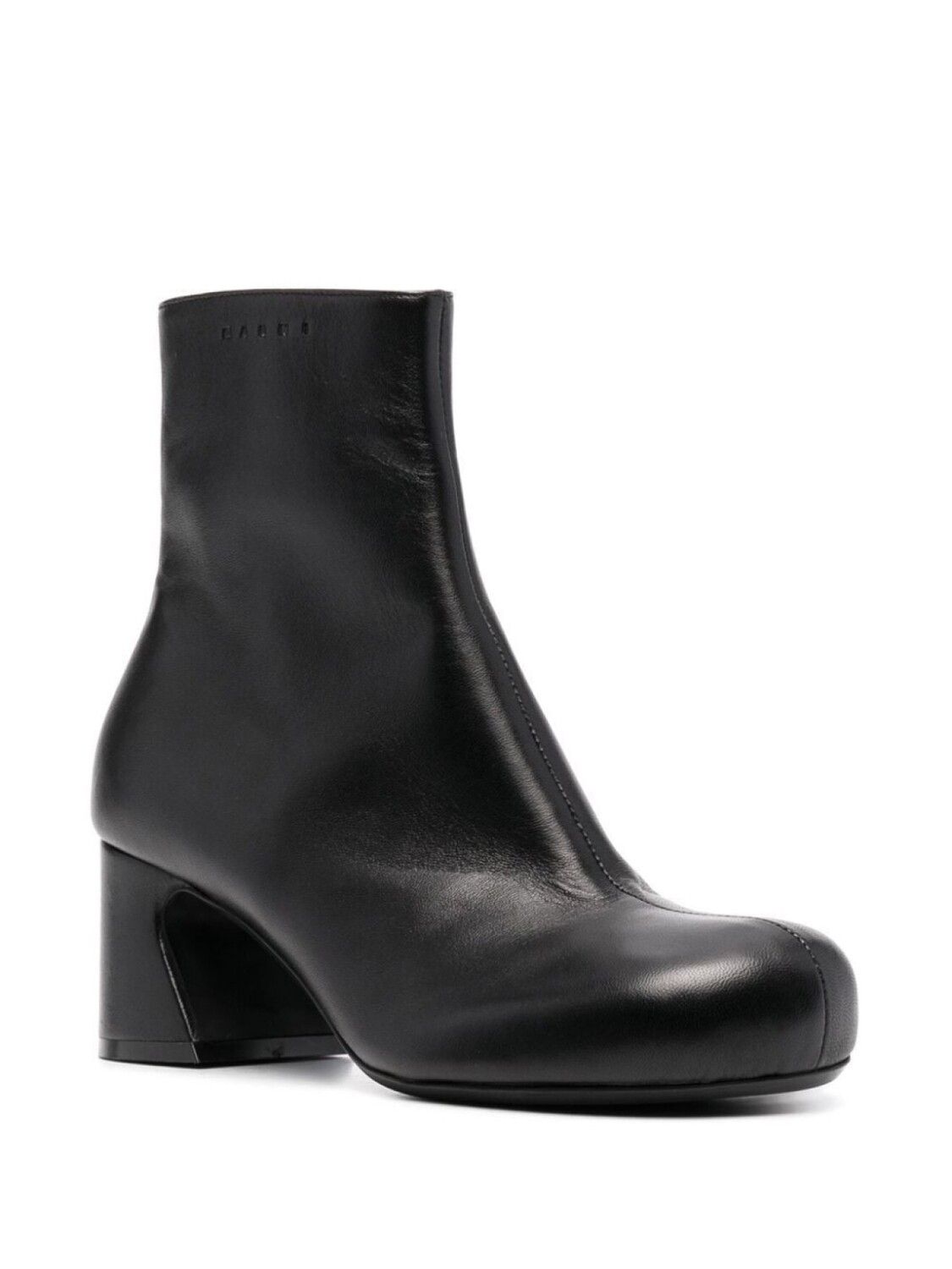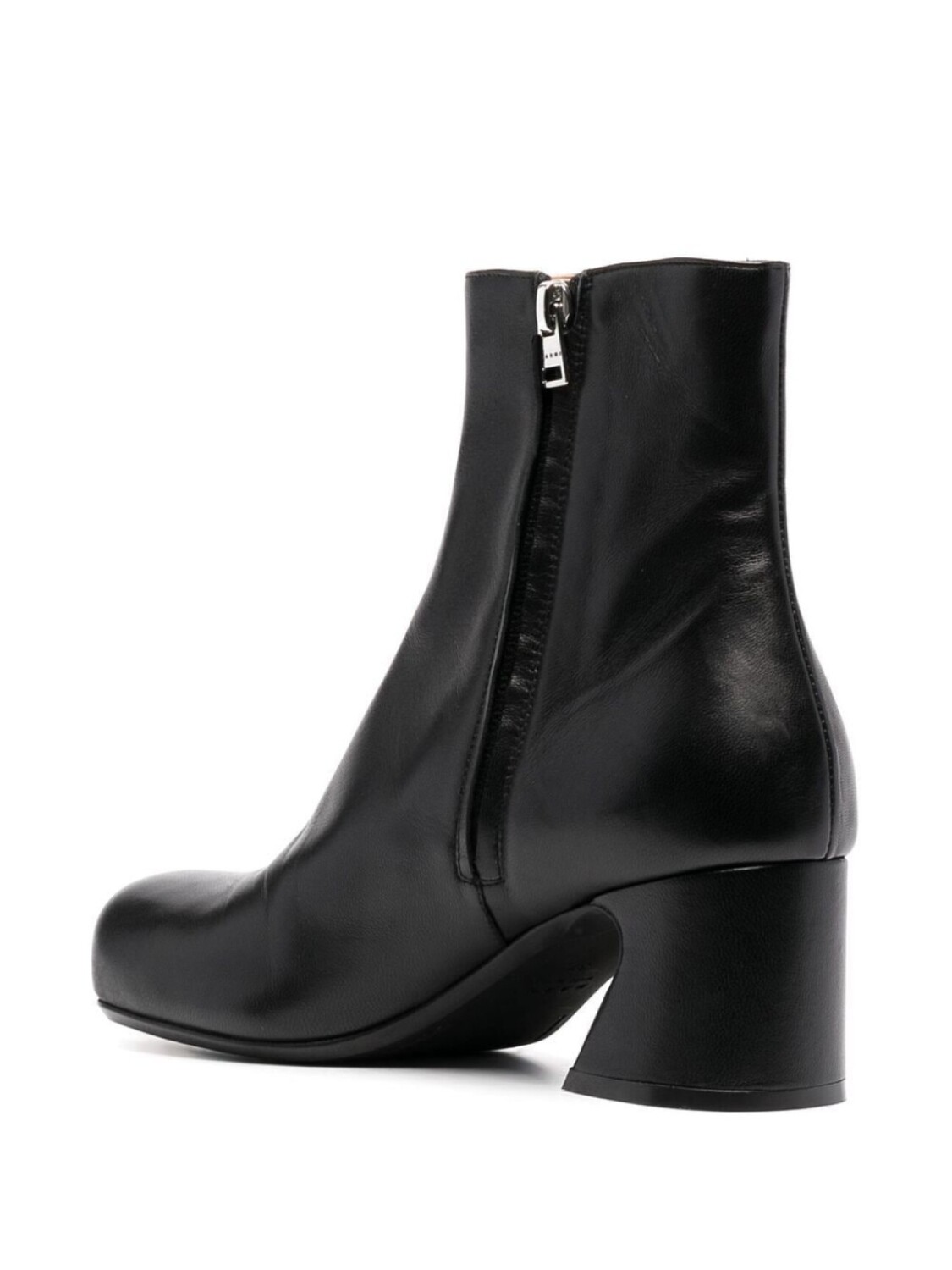 Черный, кожа, застежка на молнии сбоку, закругленный носок и низкий блочный каблук.