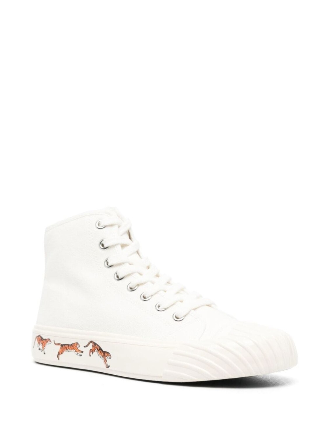 Белый, парусина, принт с изображением тигра, принт с логотипом сзади, застежка на молнии сбоку, шнуровка спереди, высота по щиколотку, закругленный носок и плоская резиновая подошва.