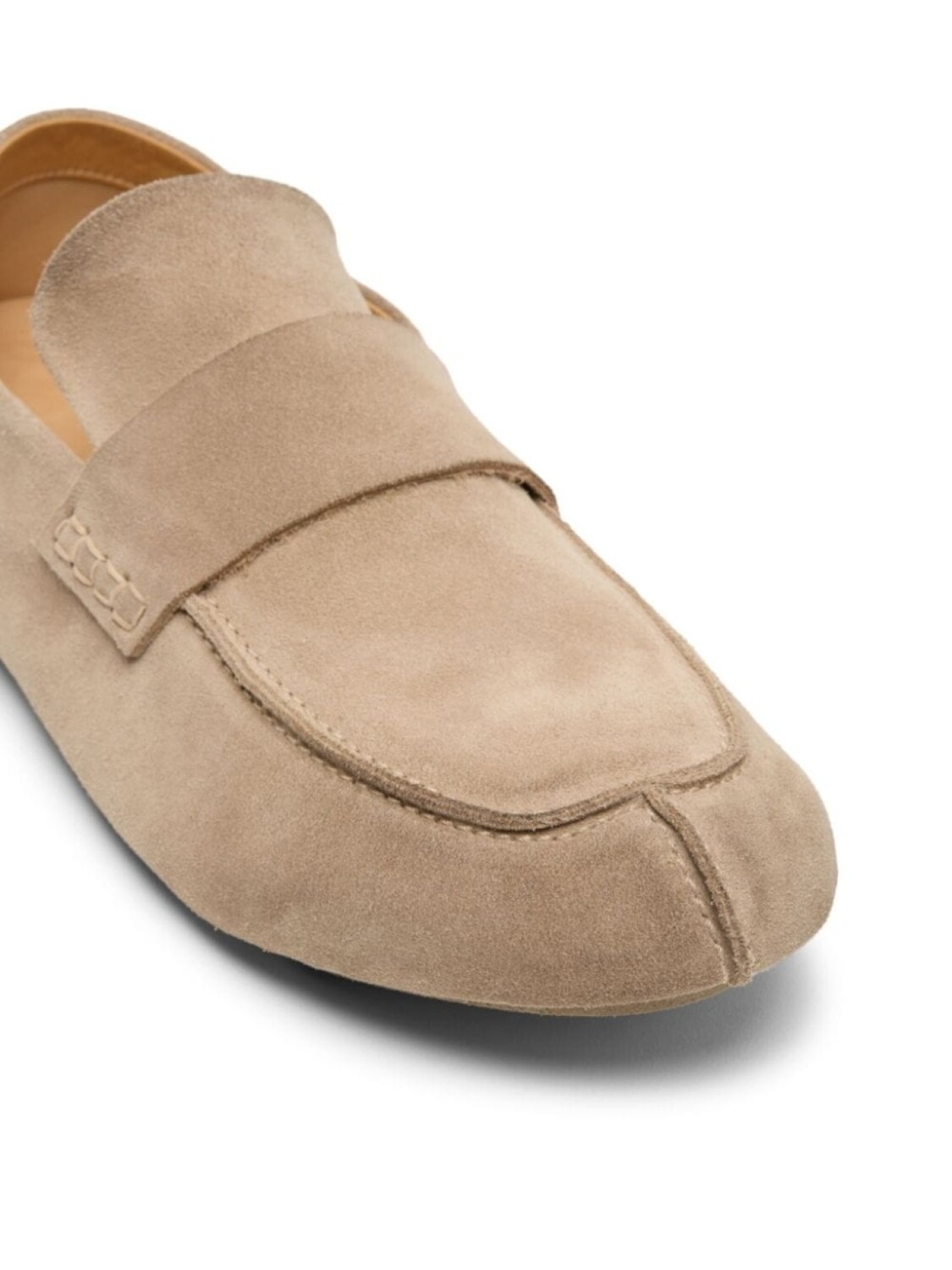 светло-бежевый, замша, закругленный носок, полукруговой шов на носке, без застежки, мягкий задник, кожаная стелька с логотипом, резиновая подошва