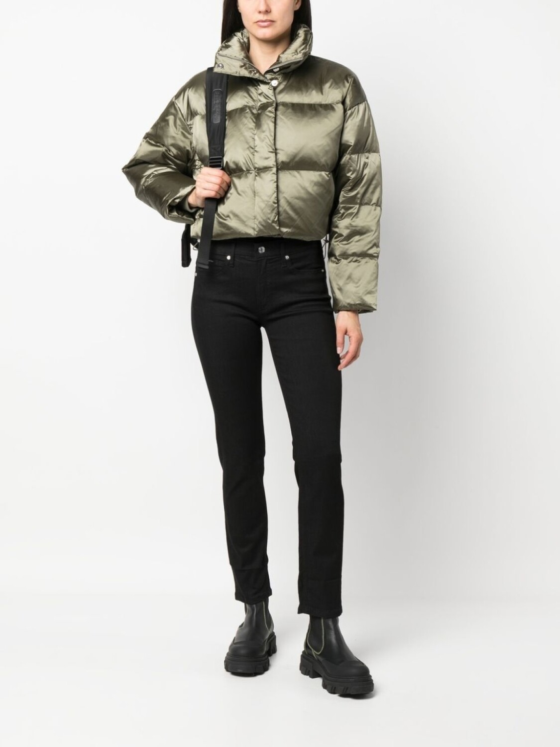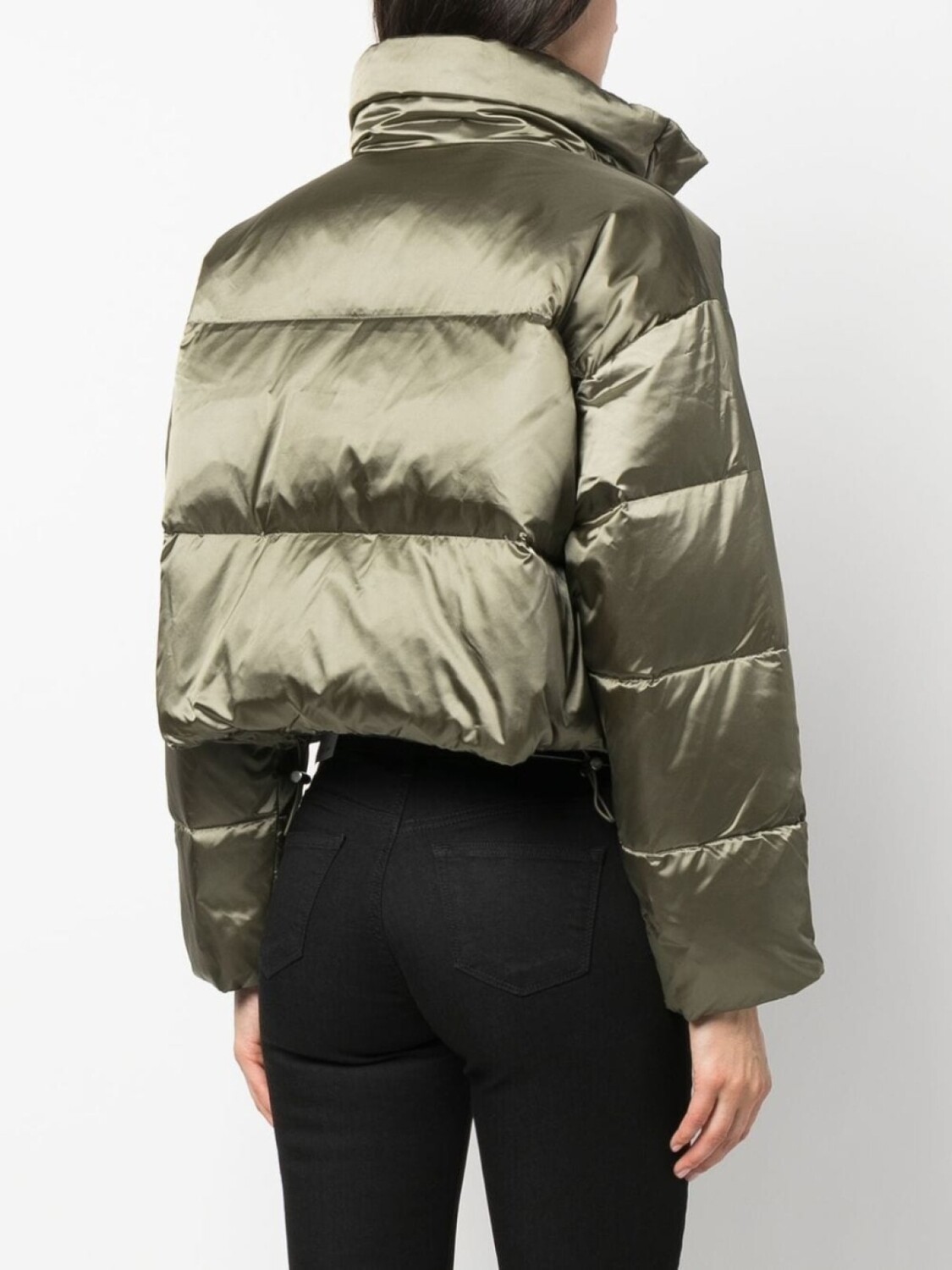 Хаки, дутые вставки, высокий воротник, потайная застежка спереди, длинные рукава, прямой подол и укороченная длина. Ответственный выбор: Этот товар как минимум на 50% состоит из переработанных или повторно использованных материалов.