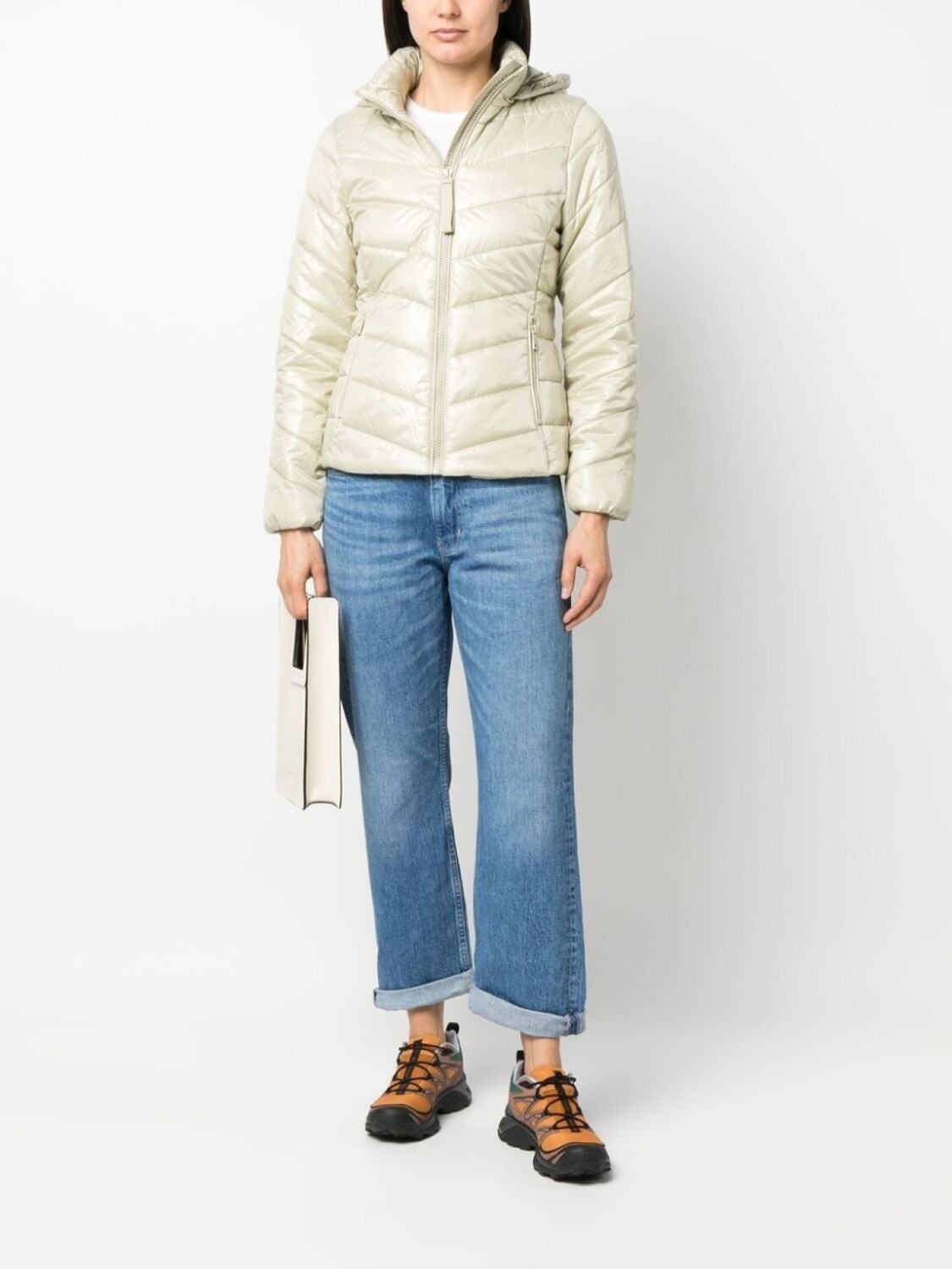Светло-серый, смесовый переработанный полиэстер, стеганая модель, съемный капюшон, высокий воротник, застежка на молнии спереди, передние карманы на молнии, длинные рукава и прямой подол.