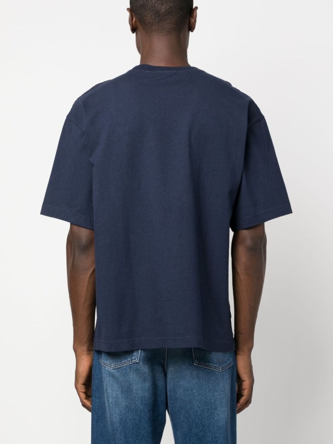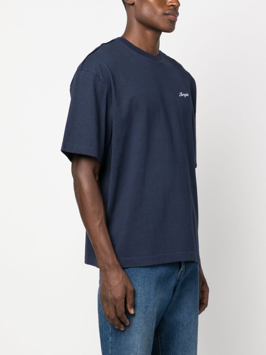 Темно-синий, органический хлопок, вышитый логотип на груди, круглый вырез, короткие рукава и прямой подол.