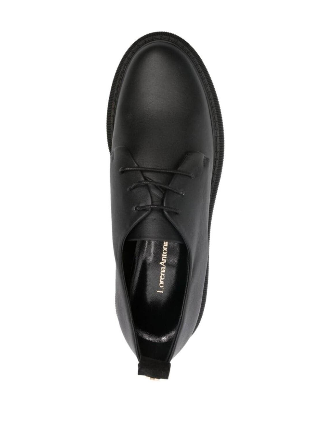 Черный, телячья кожа, гладкая текстура кожи, шнуровка спереди, петля для подтягивания сзади, закругленный носок, низкий блочный каблук, подошва на платформе и стелька с логотипом.