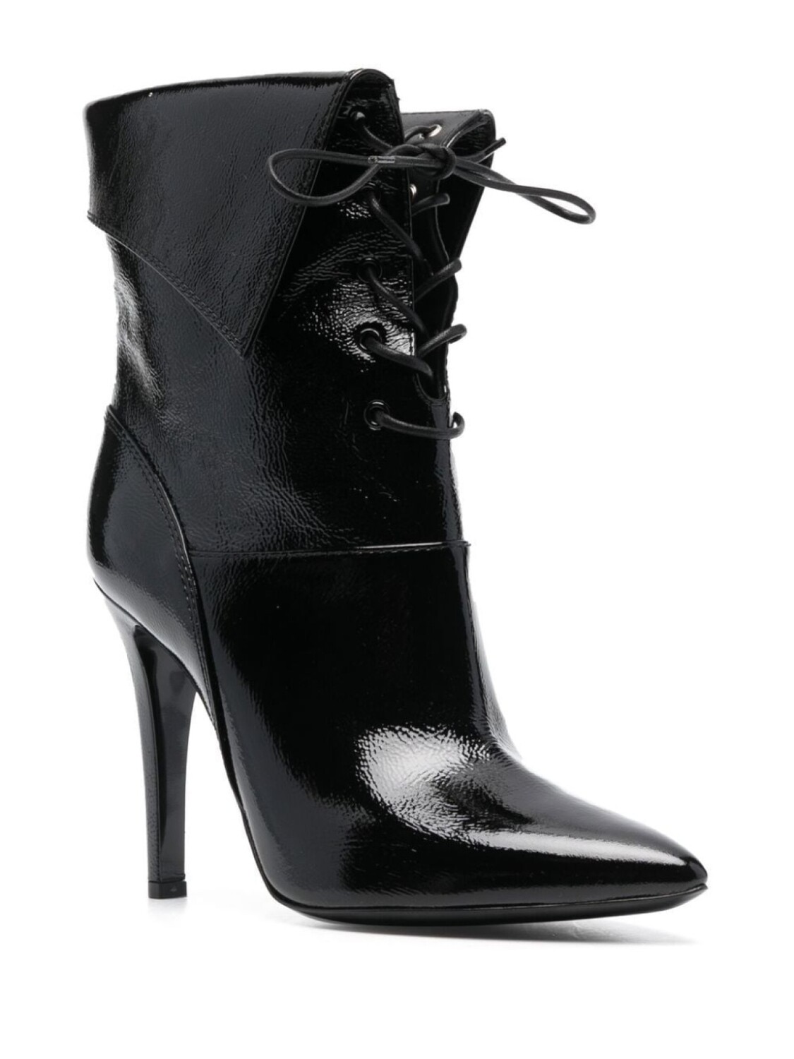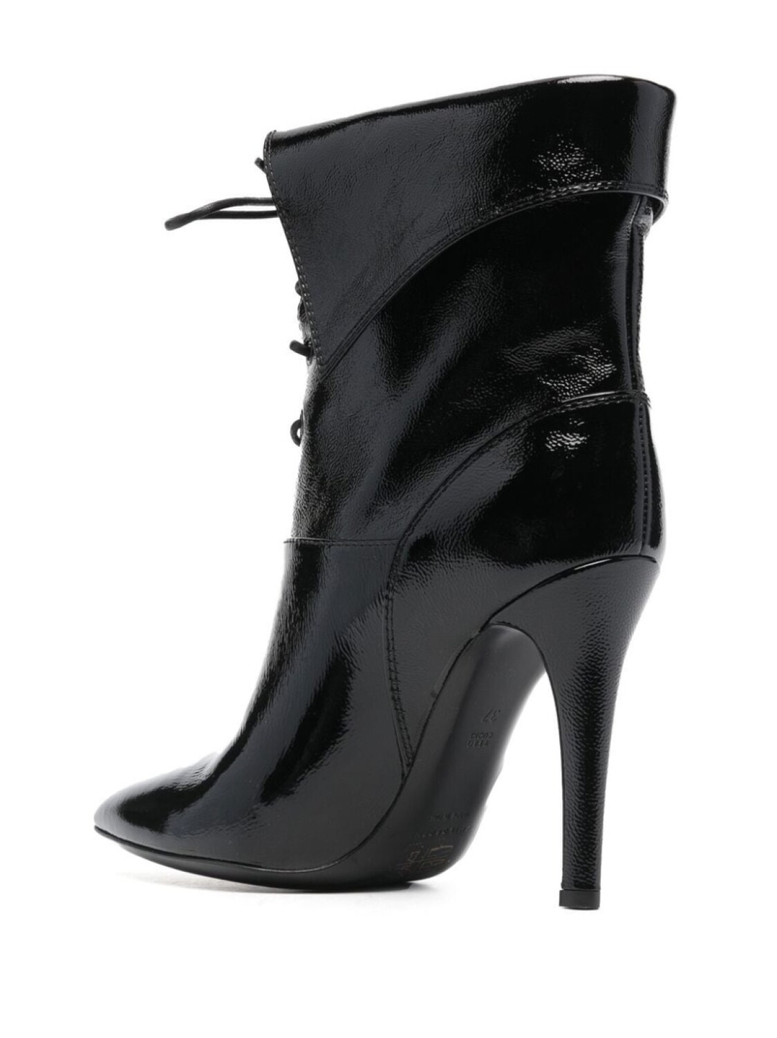 Черный, телячья кожа, заостренный носок, шнуровка спереди, высота по щиколотку и высокий каблук.