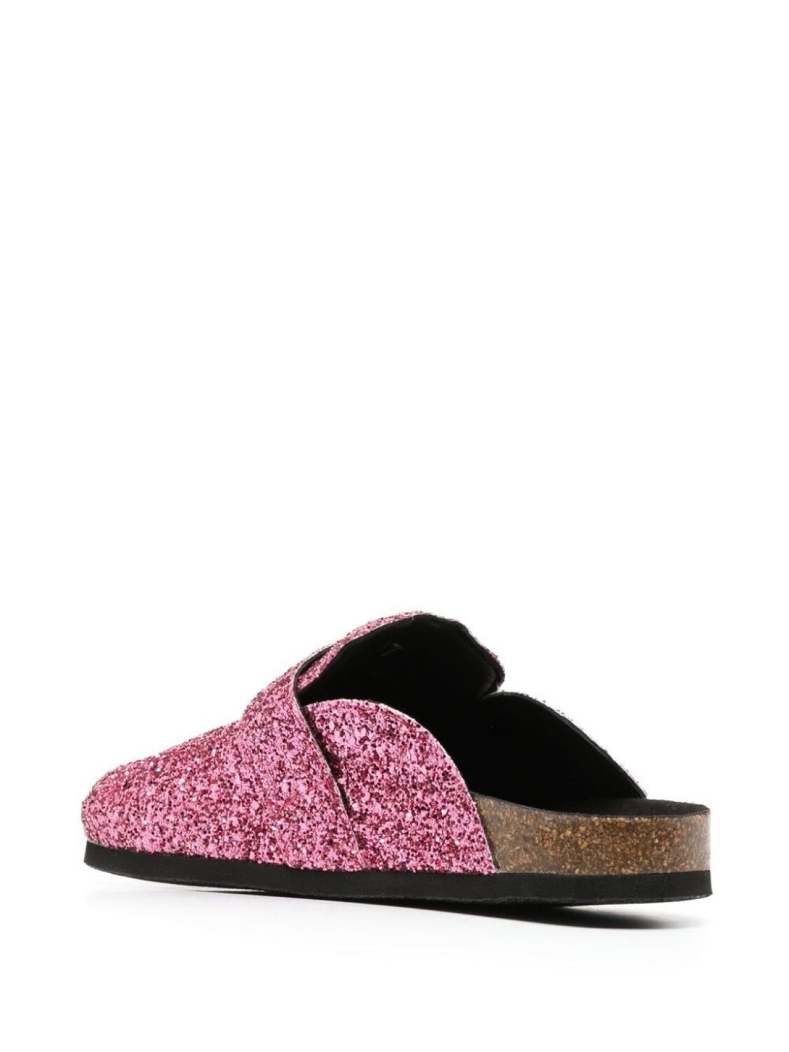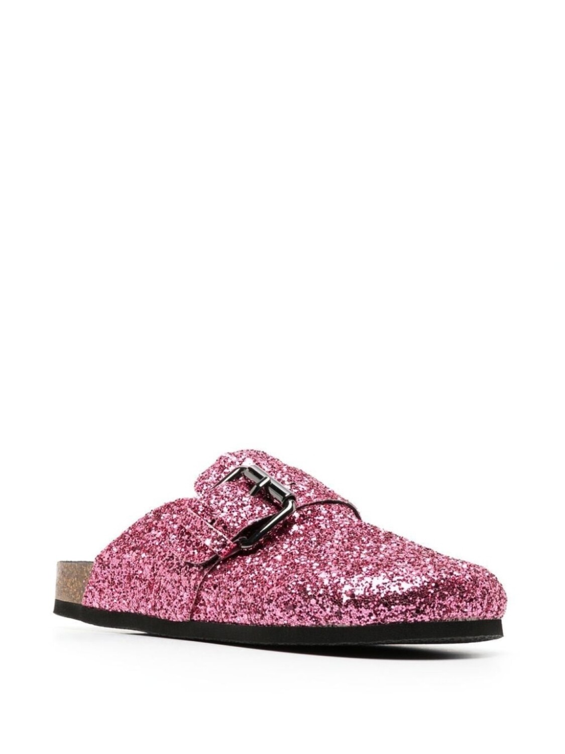 Розовый, телячья кожа, модель без застежки, блестящий материал, декоративные пряжки, стелька с логотипом, пробковая подошва и плоская резиновая подошва.