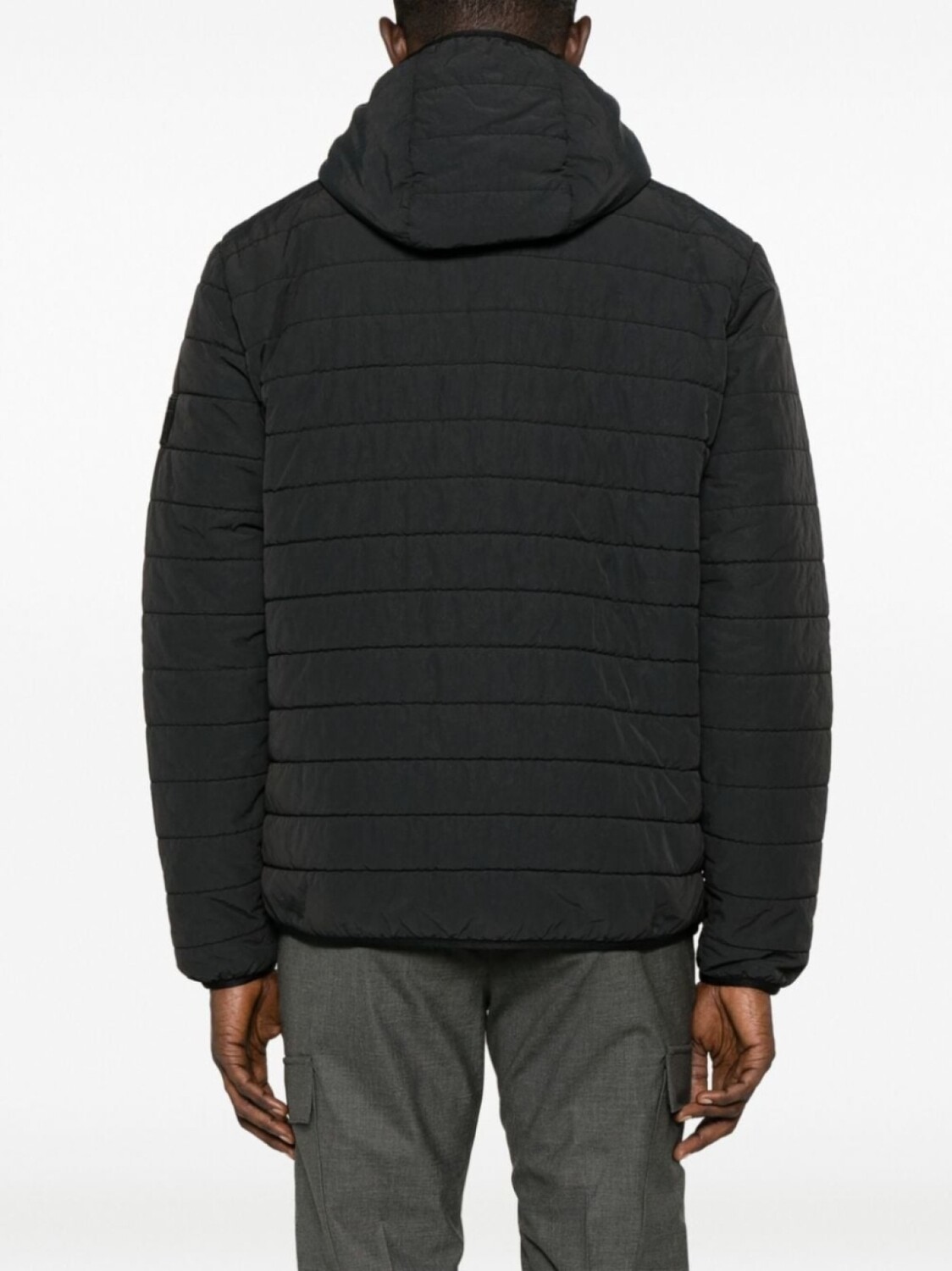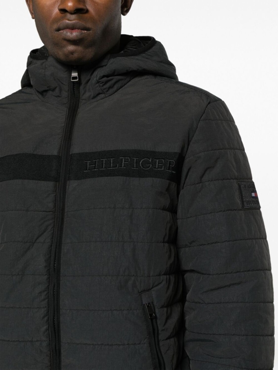 Черный, дутый материал, однотонная расцветка, вышитый логотип на груди, нашивка с логотипом на рукаве, полоски, классический капюшон, застежка на молнии спереди, длинные рукава, эластичные манжеты, два кармана на молнии по бокам и прямой подол.