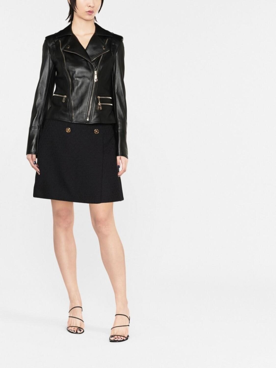 Черный, овечья кожа, зазубренные лацканы, эполеты, смещенная застежка на молнии спереди, передние карманы на молнии, длинные рукава, прямой подол, укороченная длина и подкладка с леопардовым принтом.