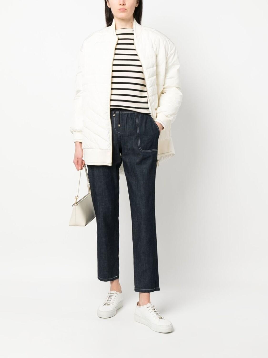 Белый, дутый материал, стеганая модель, двусторонняя молния спереди, два прорезных кармана сбоку, длинные рукава, эластичные манжеты и эластичный подол.