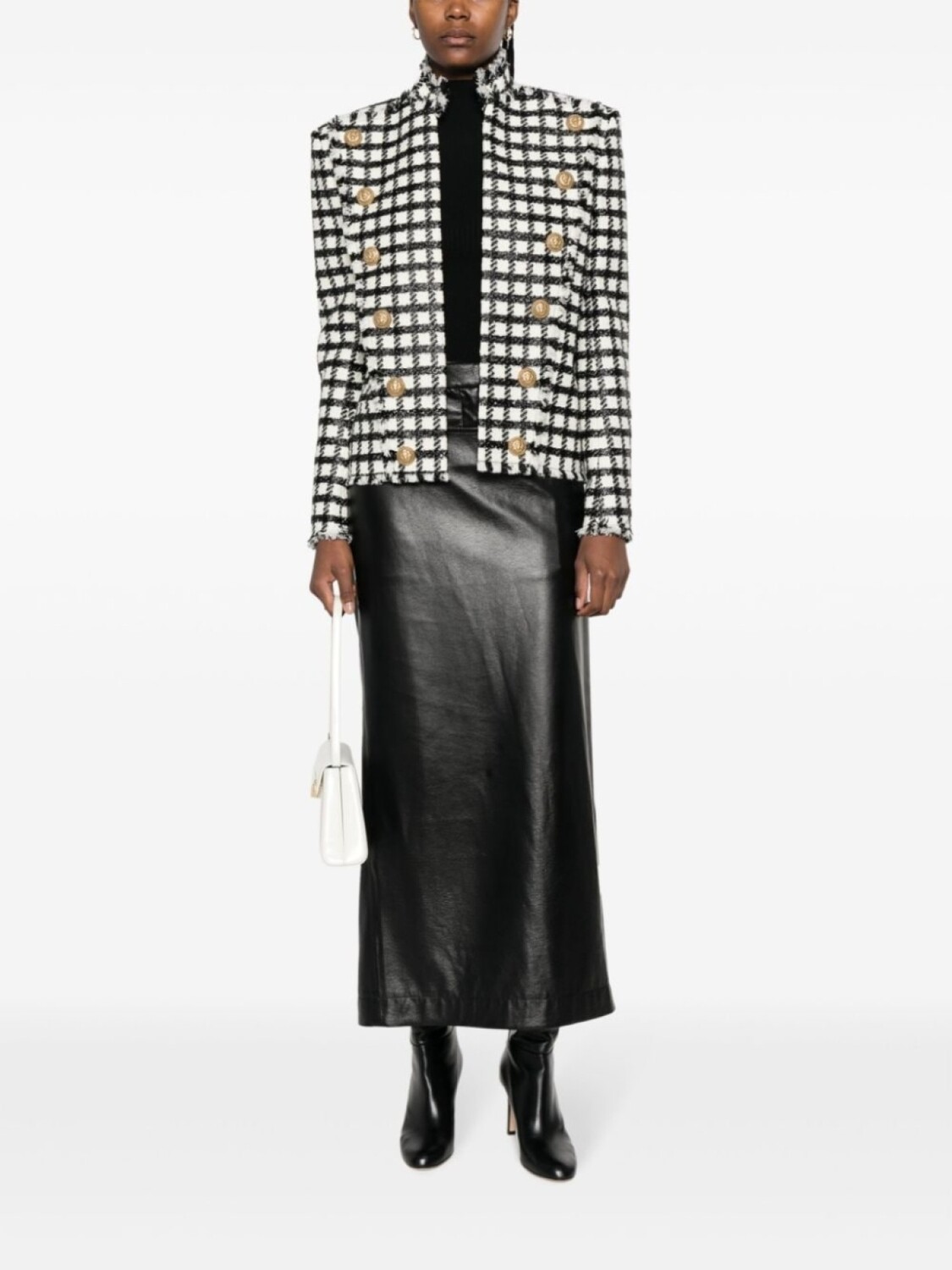 Белый/черный, смесовая необработанная шерсть, клетчатый узор, воротник-стойка, модель без застежки, длинные рукава, пуговицы с тисненым логотипом и необработанные края.