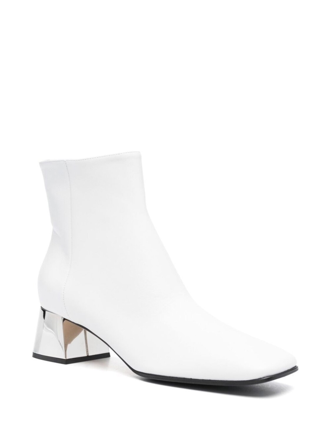 Белый, серебристый, телячья кожа, квадратный носок, застежка на молнии сбоку и блочный каблук средней высоты.