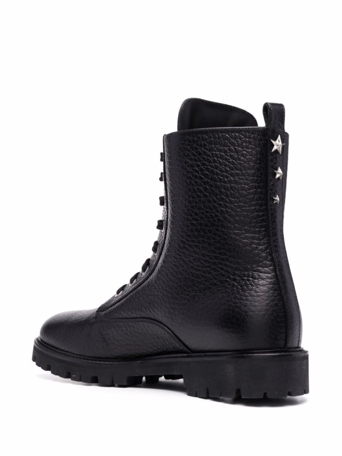 Зернистая текстура, серебристые заклепки, заклепки в форме звезд, металлический логотип на язычке, петля для подтягивания сзади, закругленный носок, шнуровка спереди, низкий каблук и резиновая подошва. Цвет: черный.