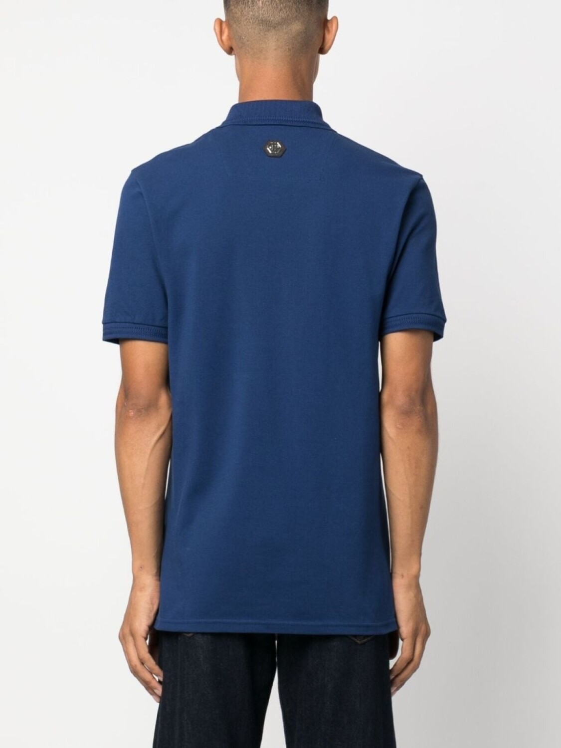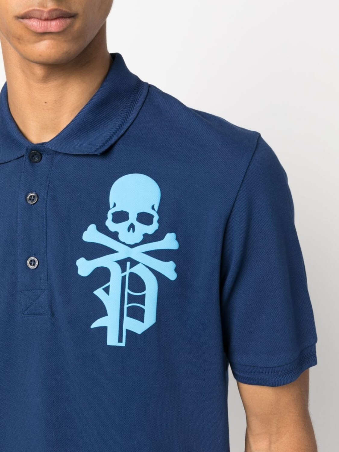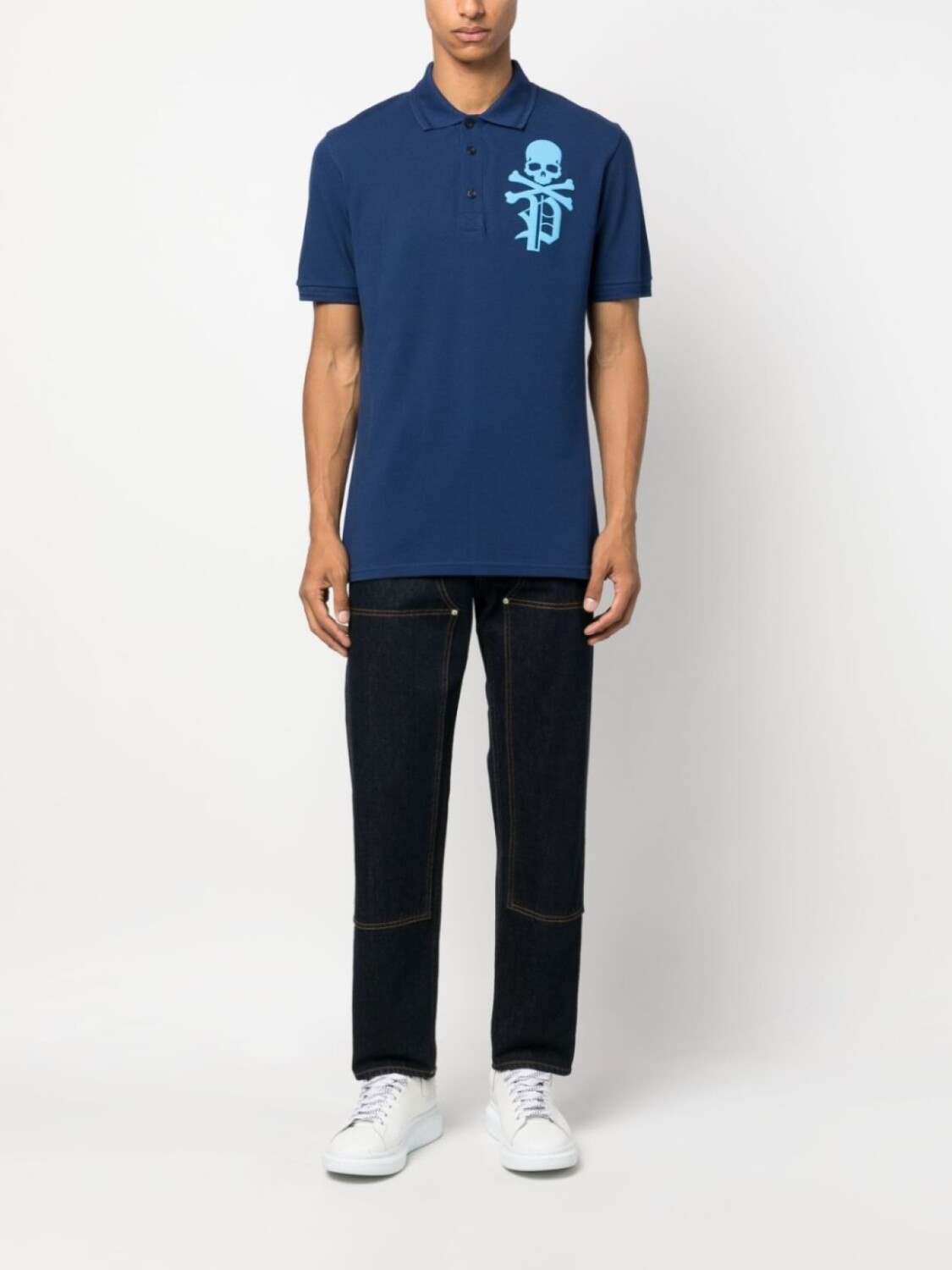 Синий, хлопок, однотонная расцветка, принт с изображением черепа, принт с логотипом на груди, воротник поло, планка на пуговицах спереди, короткие рукава и прямой подол.