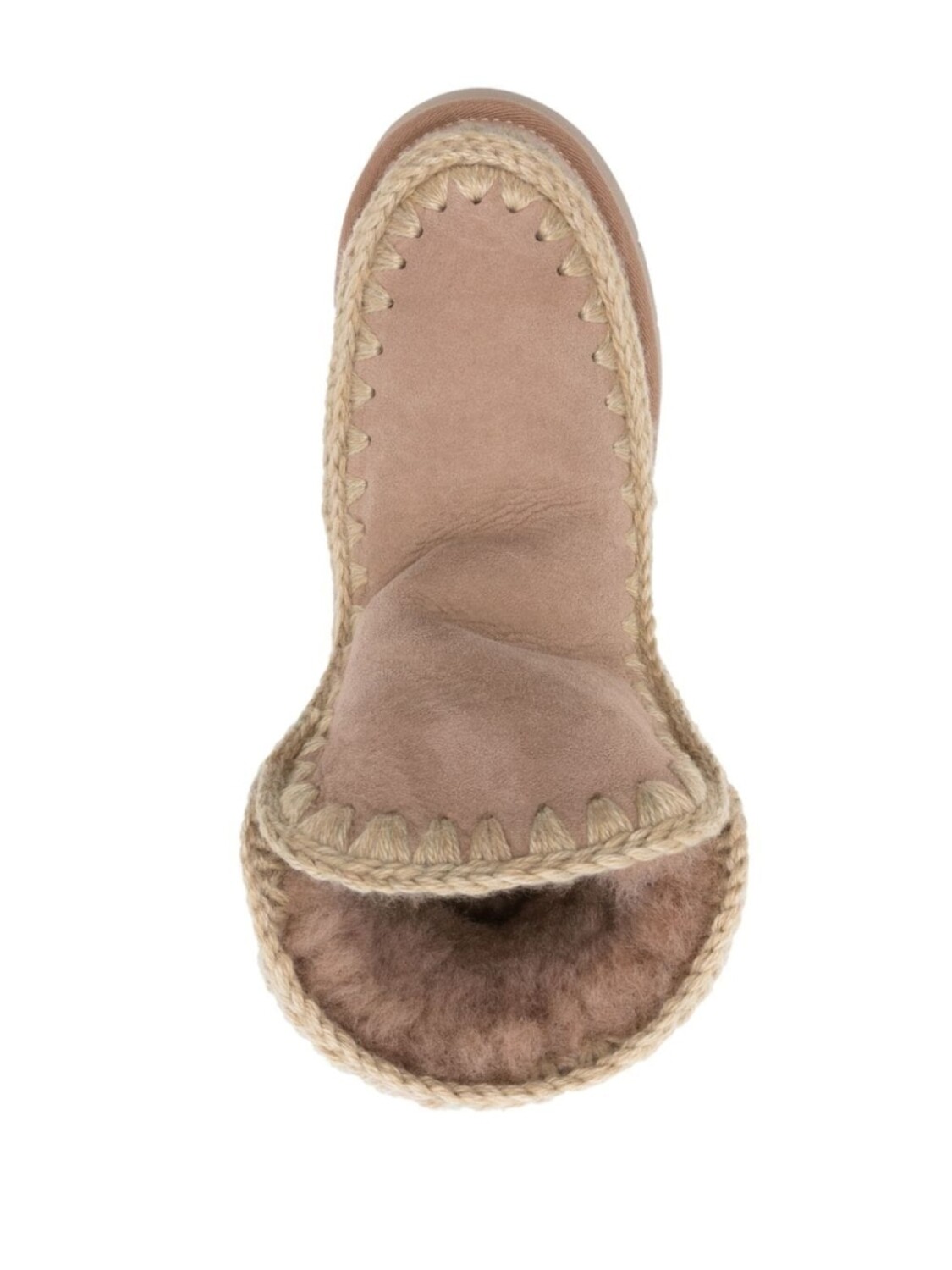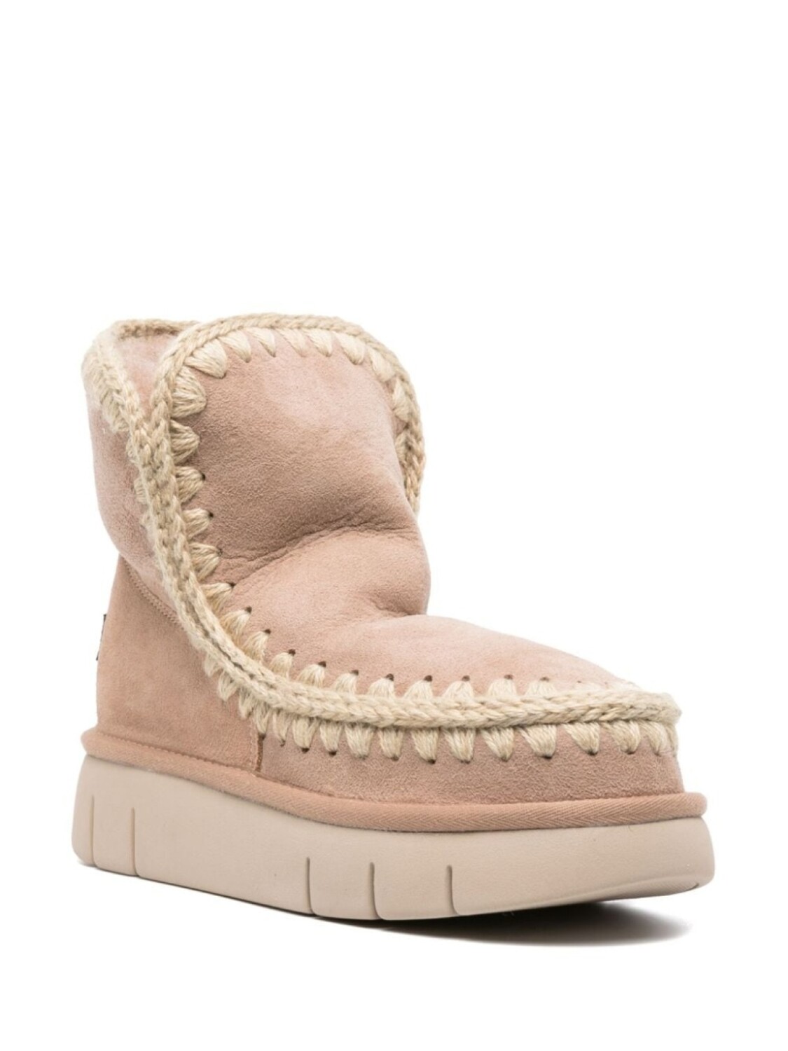 Пудрово-розовый, овечья кожа, строчка в тон, обметочный шов, закругленный носок, модель без застежки, высота по щиколотку и плоская резиновая подошва.