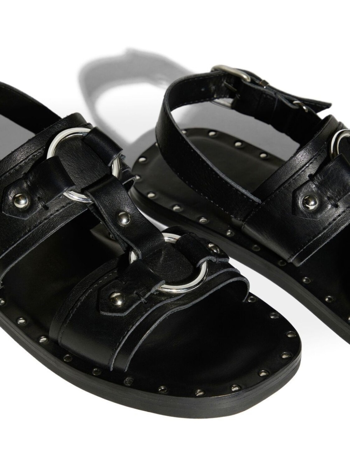 Черный, телячья кожа, серебристые заклепки, открытый носок, квадратный носок, перекрестные ремешки, ремешок на щиколотке с пряжкой, логотип на стельке и плоская подошва.
