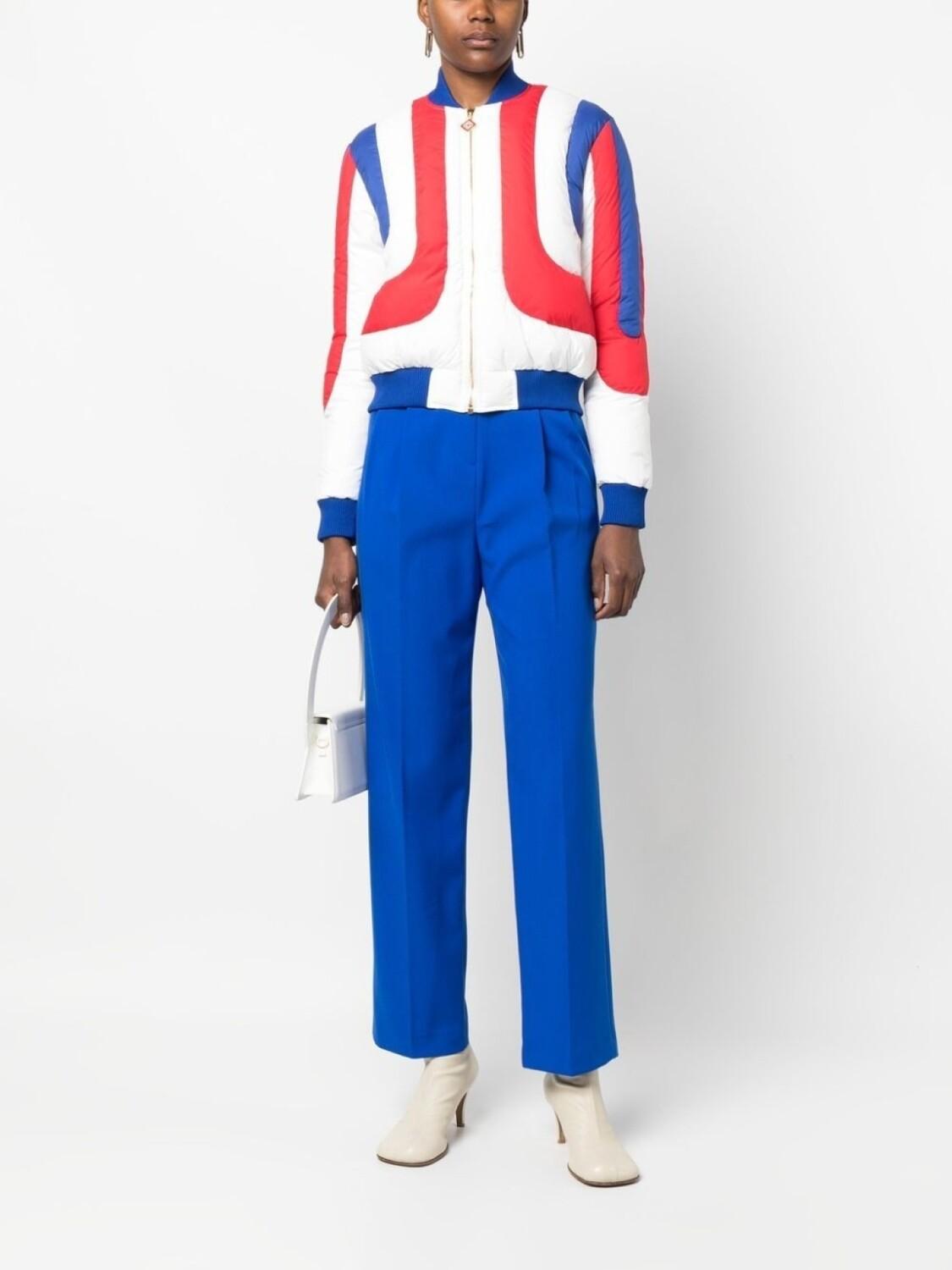 Красный/белый/синий, дутый материал, воротник-стойка, длинные рукава и застежка на молнии спереди.