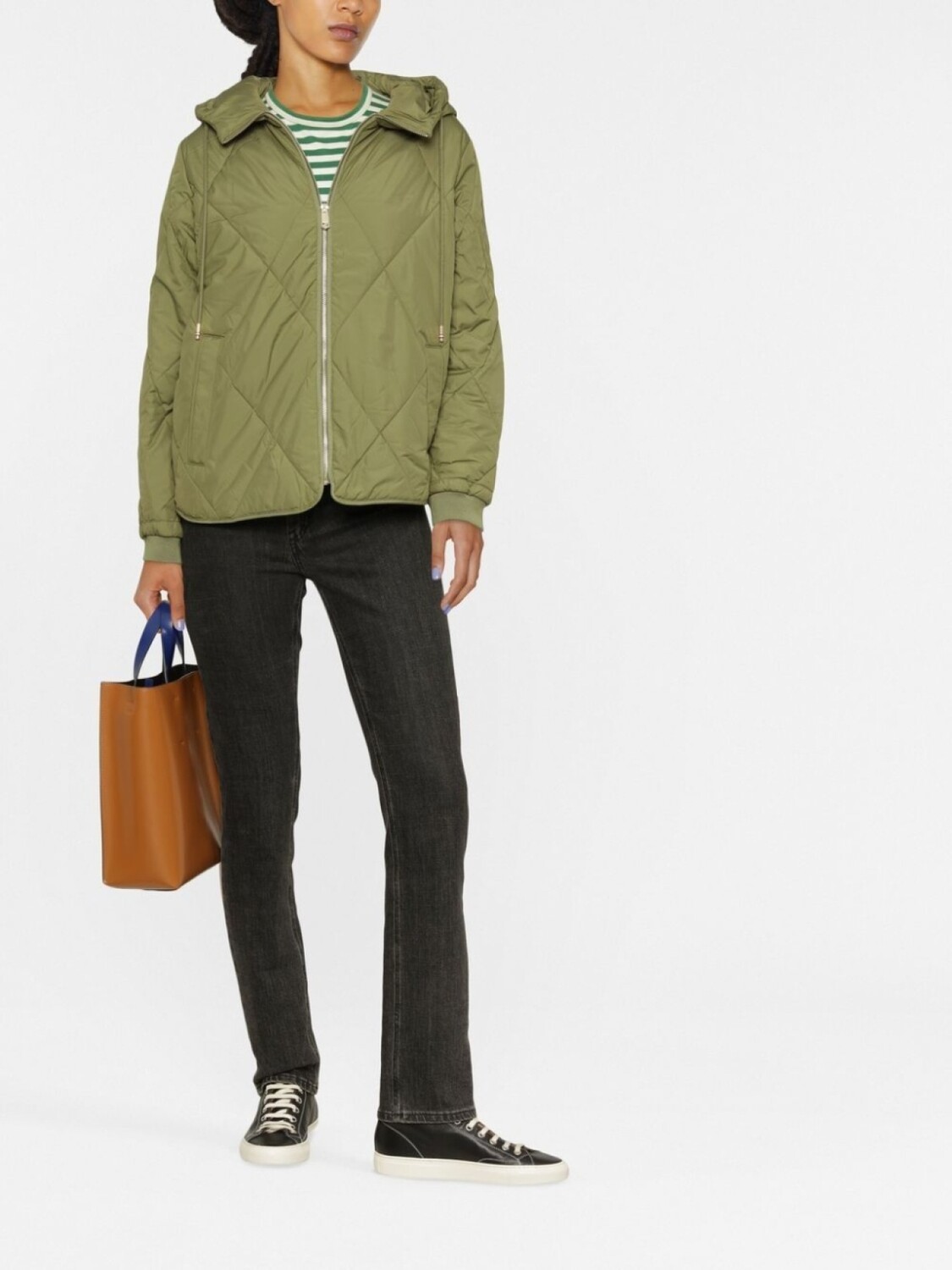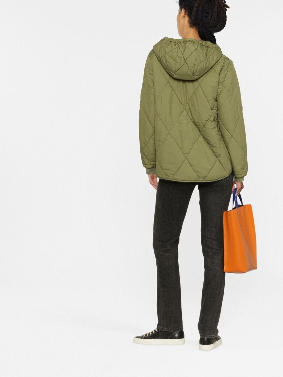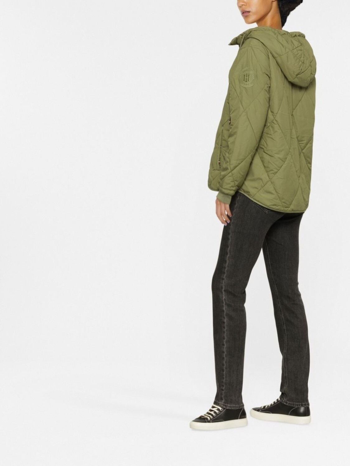 Оливковый, дутый материал, нашивка с логотипом сбоку, стеганый материал, затягивающийся на шнурок капюшон, застежка на молнии спереди, длинные рукава и манжеты в рубчик.