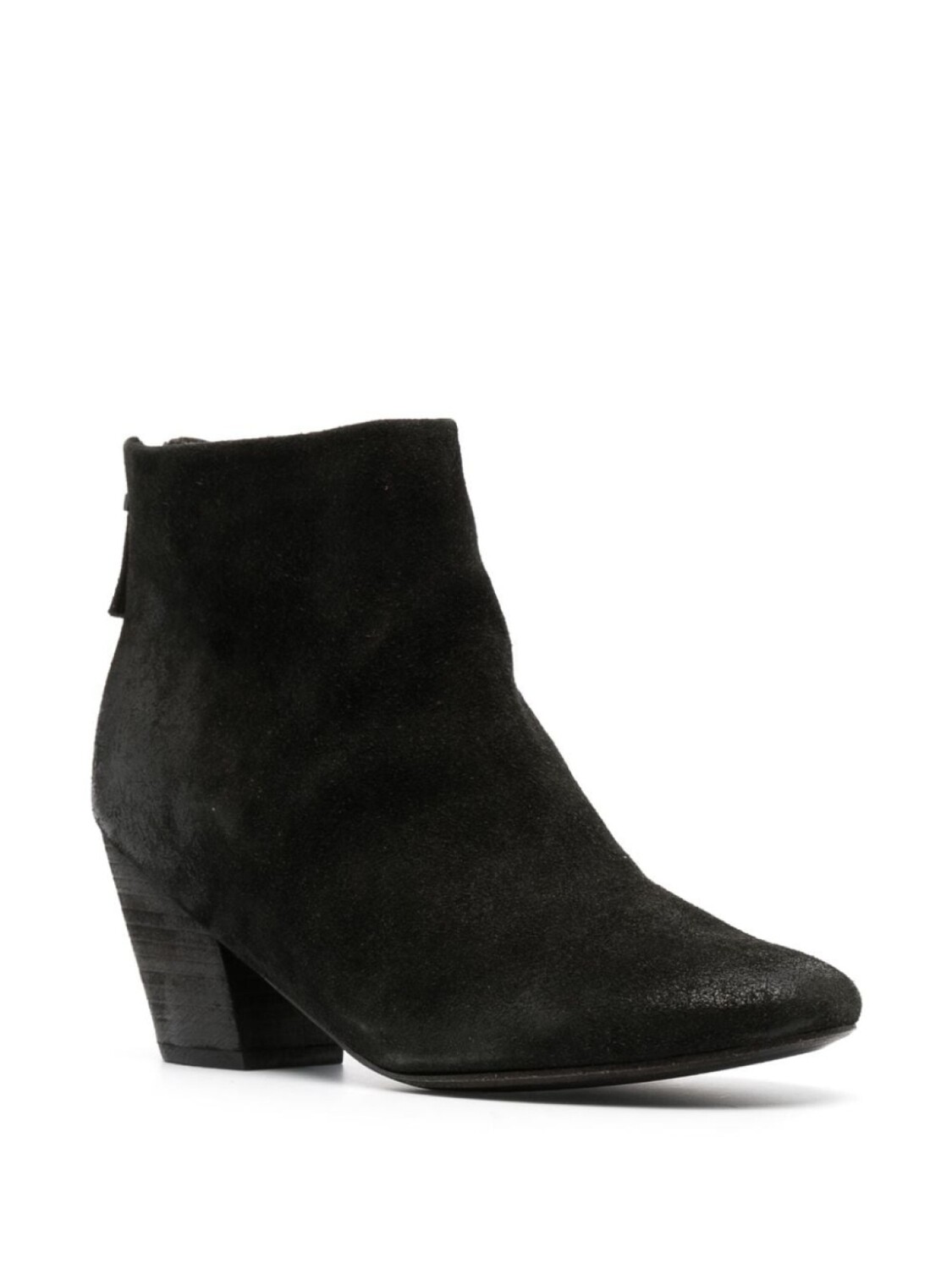 Черный, телячья кожа, закругленный носок, застежка на молнии сзади, высота по щиколотку, блочный каблук, кожаная стелька с логотипом и кожаная подошва.