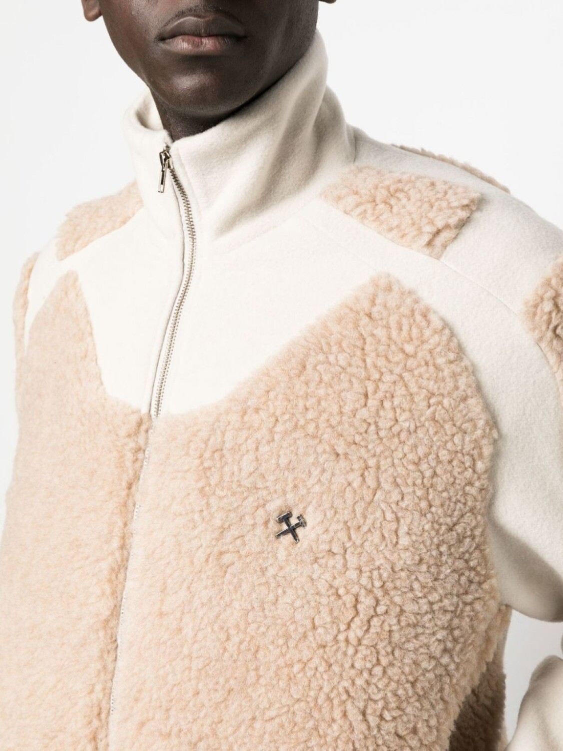 Шерсть, фактурная отделка, воротник-труба, металлический логотип, застежка на молнии спереди, длинные рукава и подол с кулиской.
