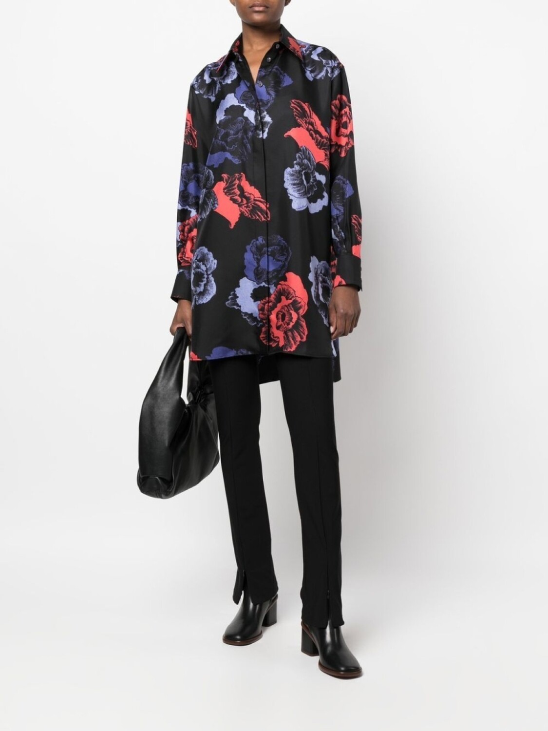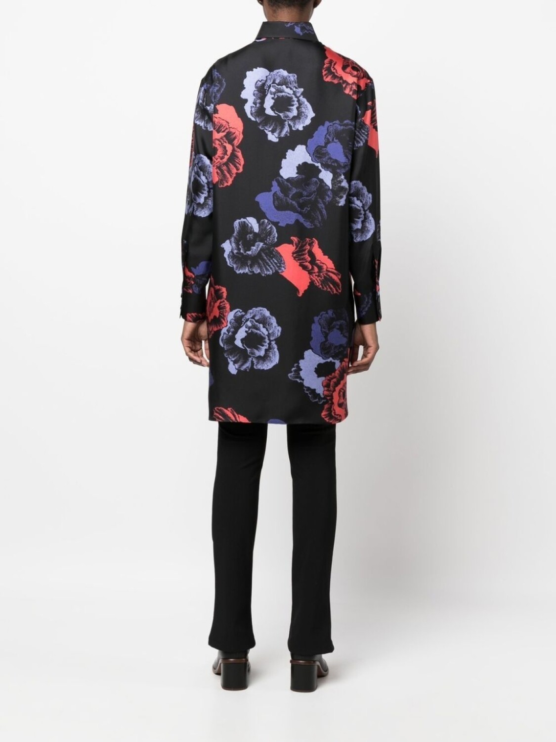 Черный, шелк, сплошной цветочный принт, классический воротник, застежка на пуговицах спереди и длинные рукава.