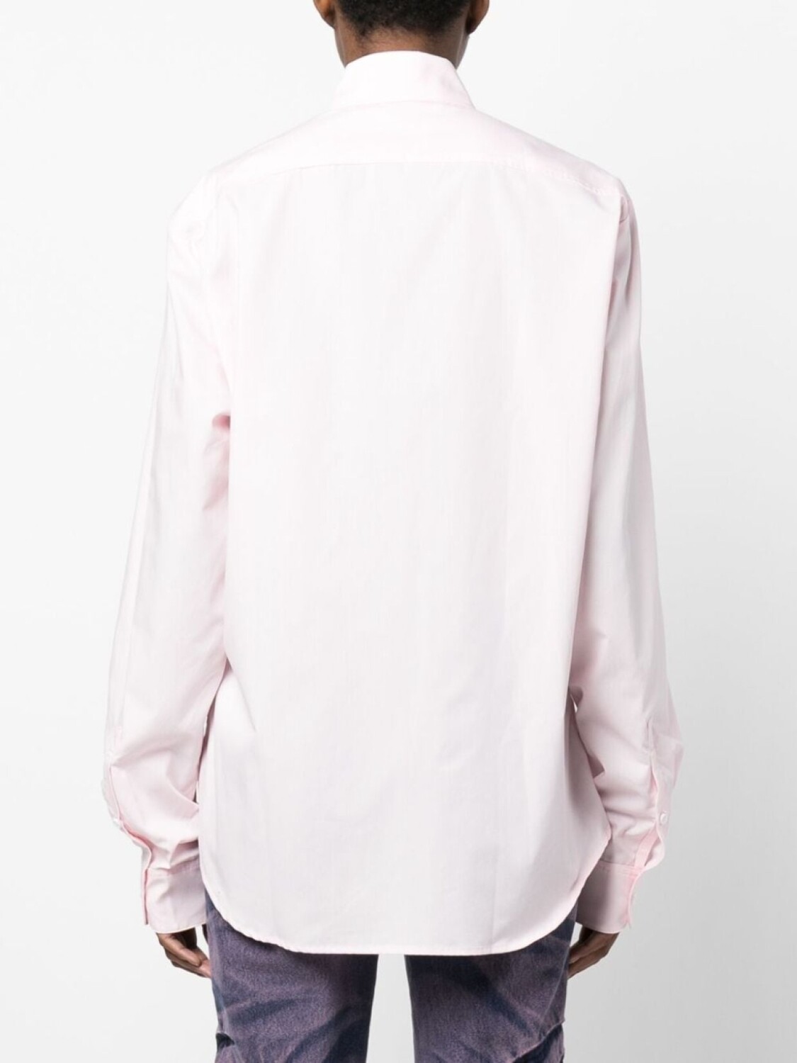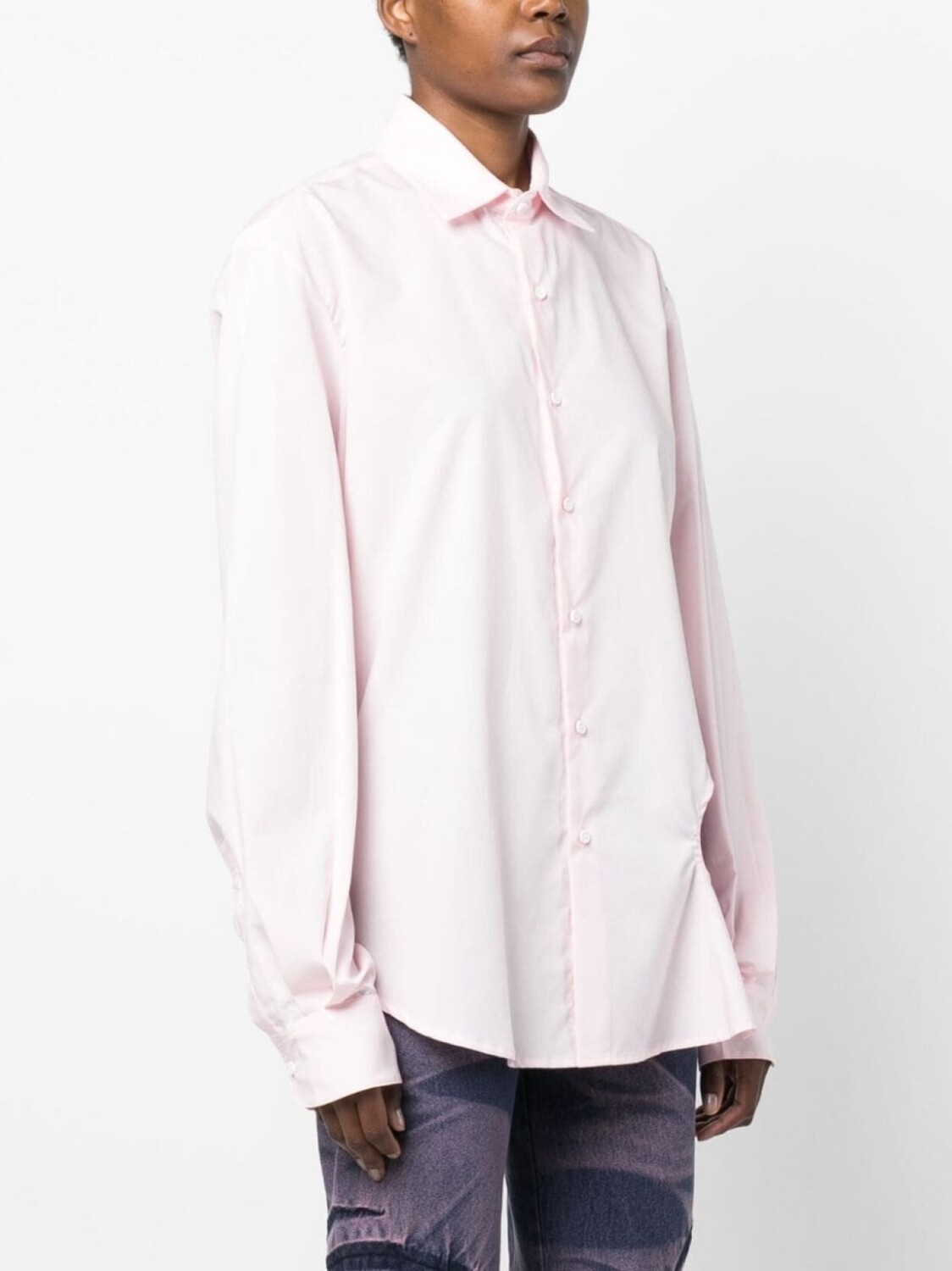 Розовый, смесовый хлопок, вырезные детали, классический воротник, застежка на пуговицах спереди, рукава с манжетами на пуговицах, длинные рукава и асимметричный подол.