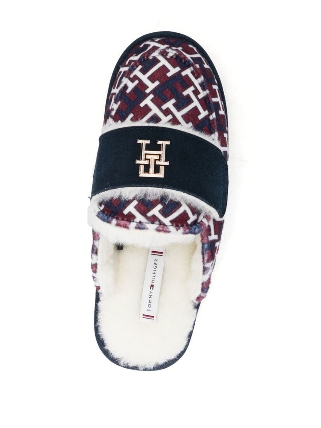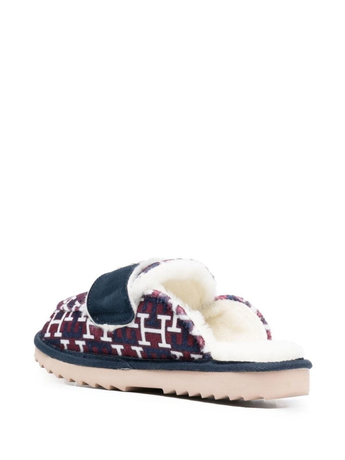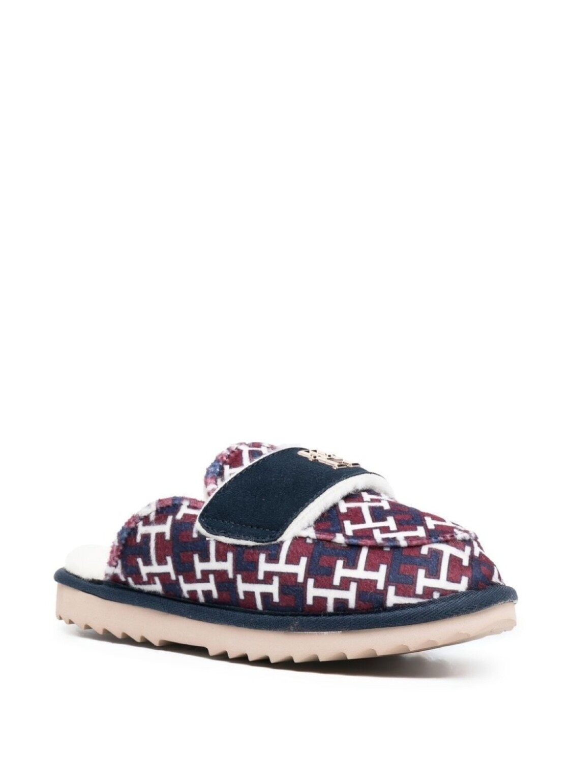 Красный/белый/синий, смесовая шерсть, узор с изображением монограммы, золотистый металлический логотип, модель без застежки и рифленая резиновая подошва.