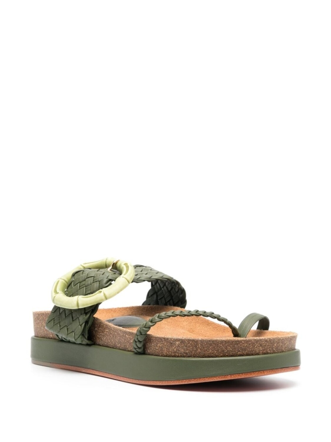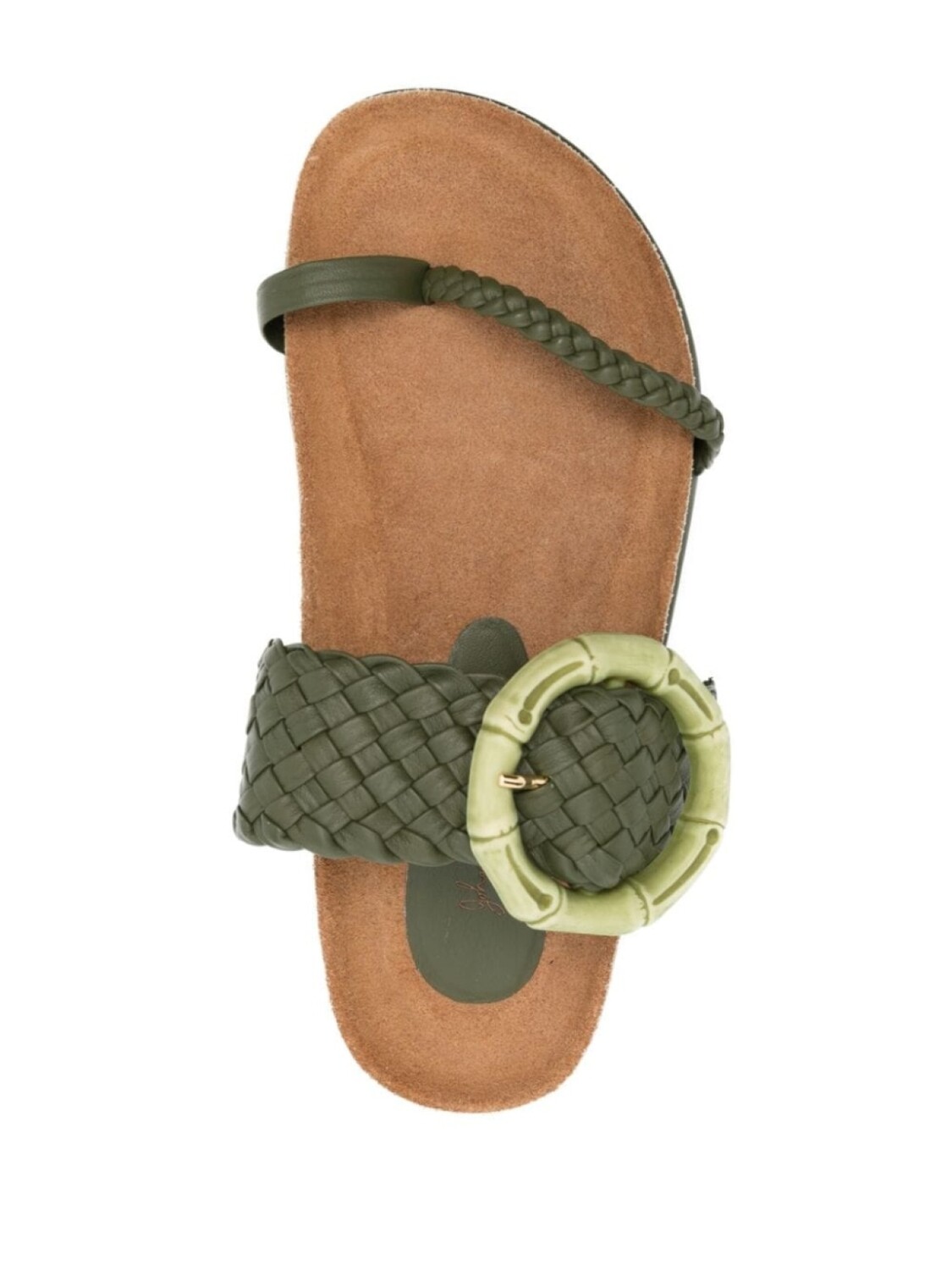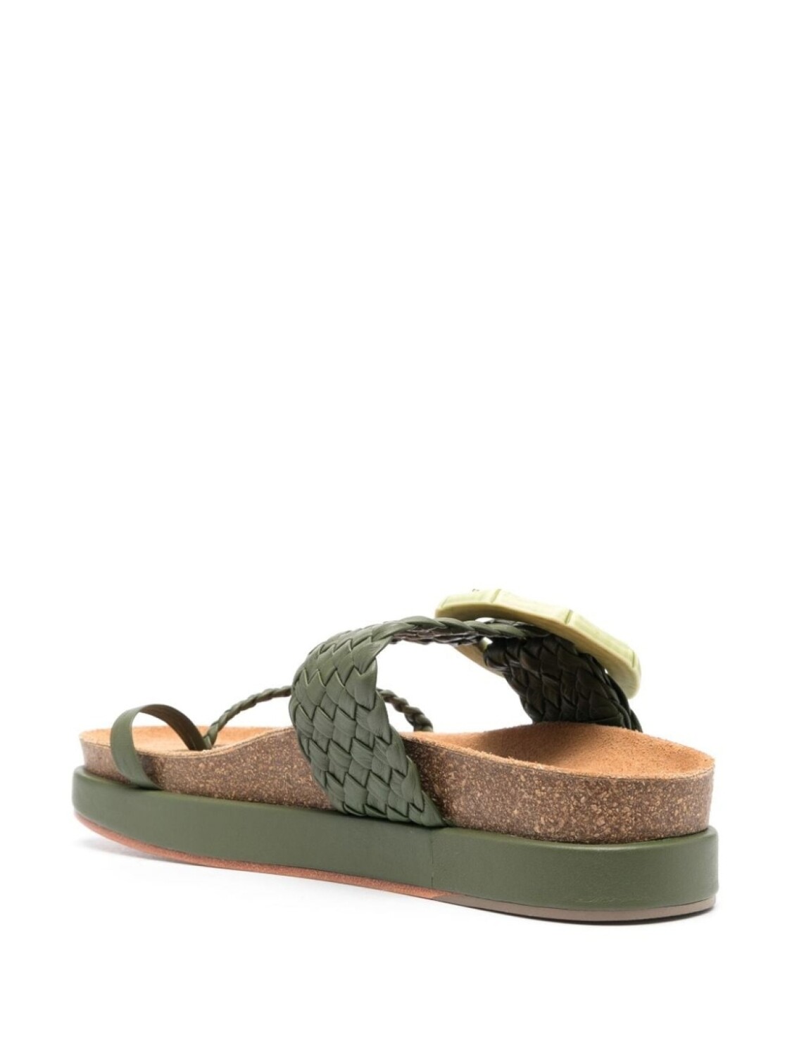 Оливково-зеленый, телячья кожа, декоративная пряжка, открытый носок, модель без застежки, логотип на стельке и плоская подошва. Узнать больше о том, какие товары получают отметку «Ответственный выбор», можно из материала «Как мы оцениваем экологичность и этичность».